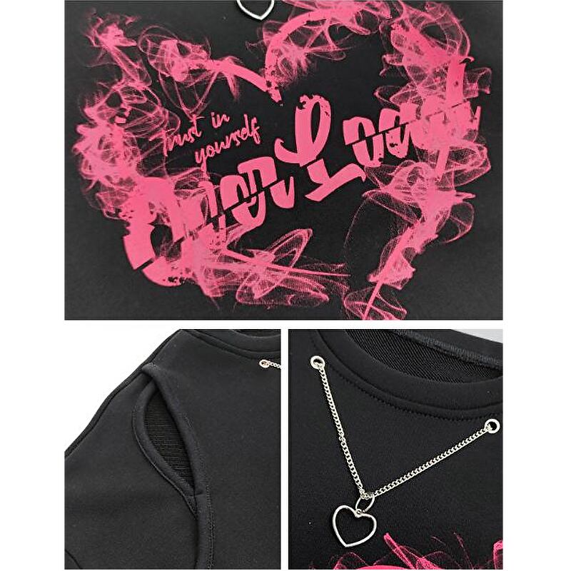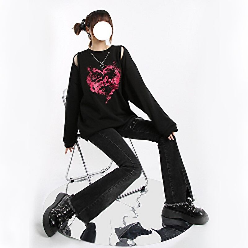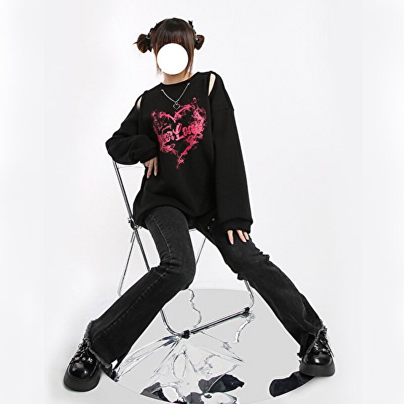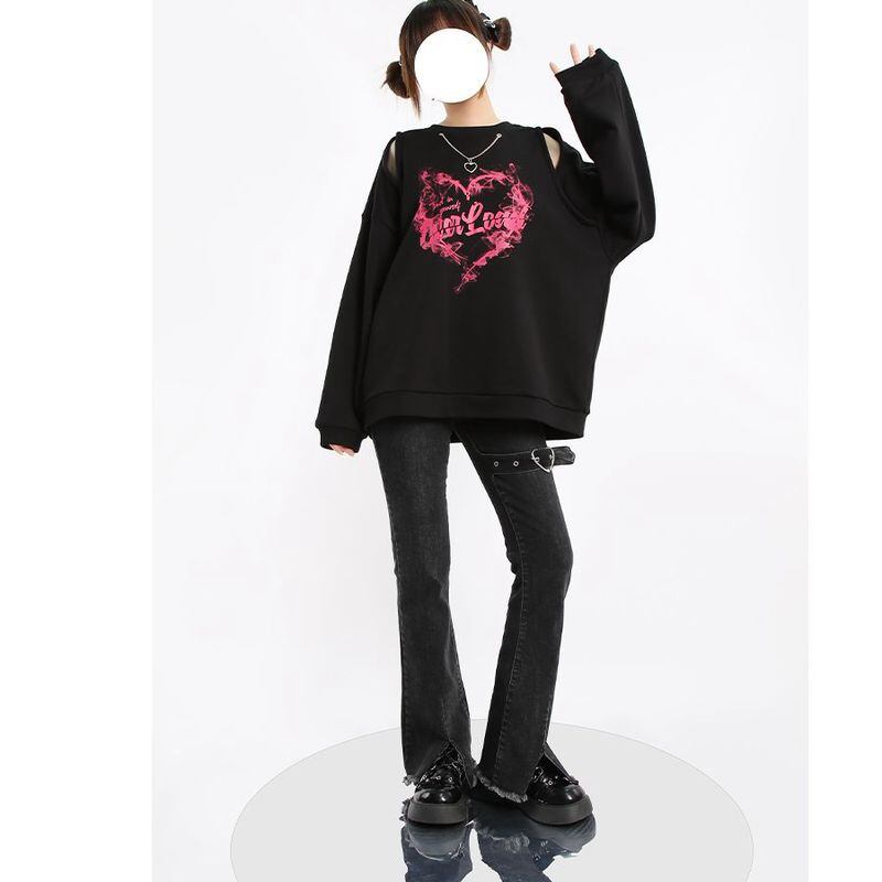 サブカル 服 地雷系 通販 Catwish ロリータ トレーナー 長袖 オフショルダー ハート ロゴ プリント チェーン ハートチャーム 付き ゴシック系 パンク系 闇かわいい セクシー JK