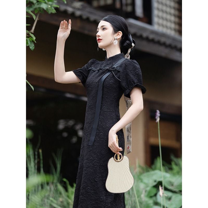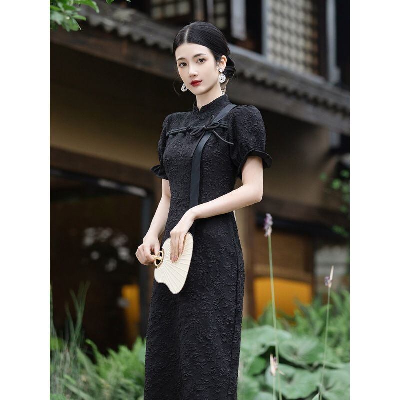 生地とパフスリーブが典型的なチャイナドレスらしさを抑えながらも、チャイナドレス特有のタイトなシルエットで細見えとエレガントな雰囲気を醸し出すことが可能に。
