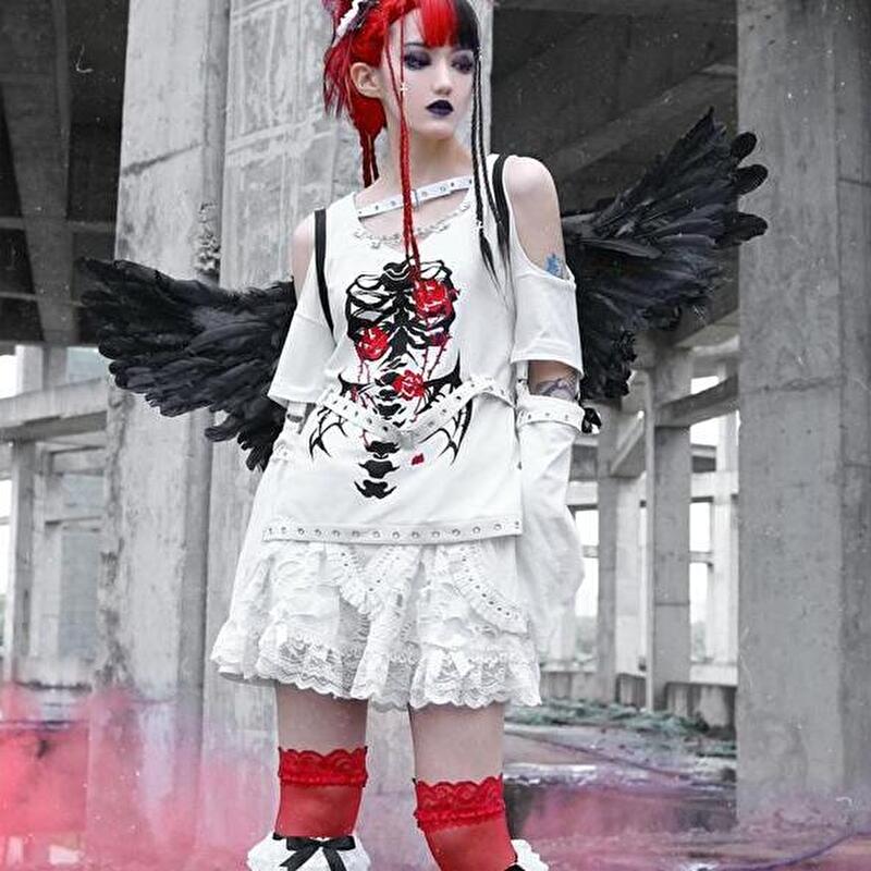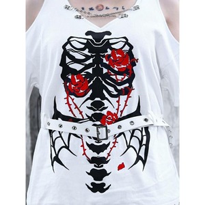 サブカル 服 地雷系 通販 BLOOD オフショルダー シャツ 袖取り外し可能 ベルト チェーン バラ スカル ダーク ロック ゴシック系 闇かわいい パンク系