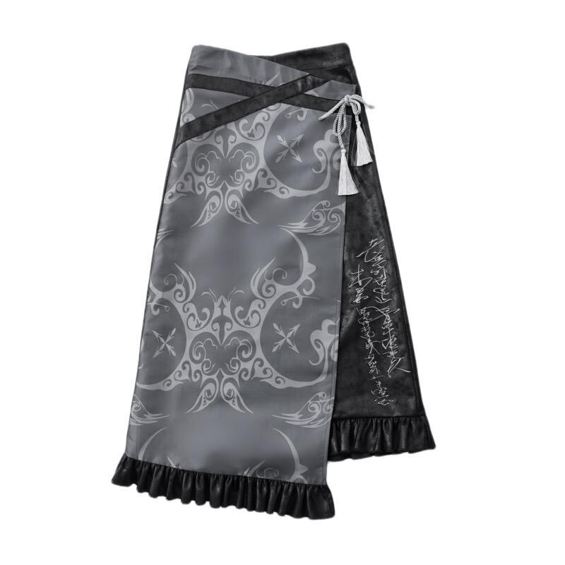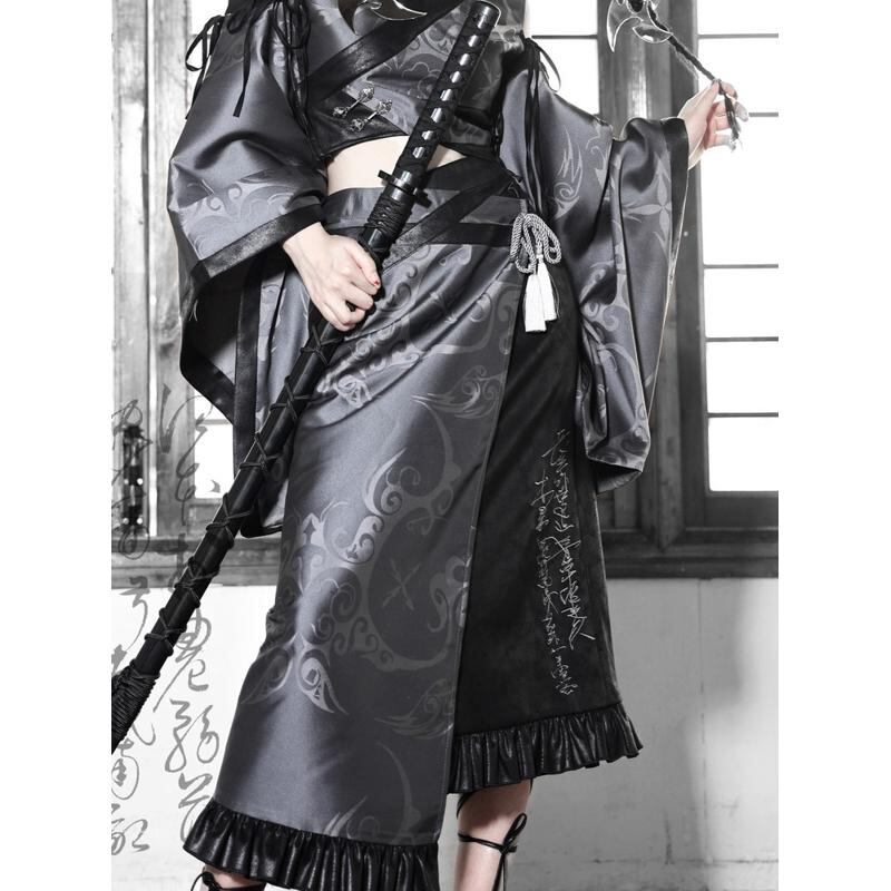 サブカル 服 地雷系 通販 BLOOD スカート 巻きスカート風 中国風 ミモレ丈 タイト 漢文 刺繍 フリル ゴシック系 ダーク コスプレ ハロウィン