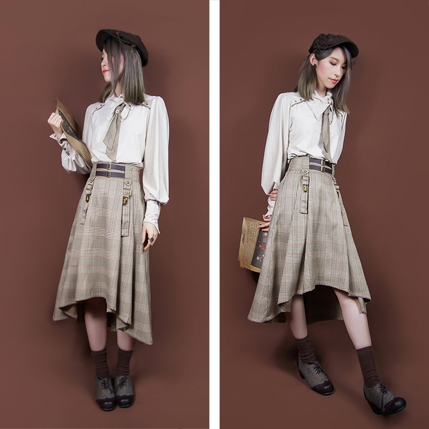 サブカル 服 地雷系 通販 スチームパンク スカート ヘム丈 チェック柄 ブリティッシュスタイル Aライン ハイウエスト 珈琲グレー ベルト ロリータ 舞台衣装 イベント サブカル好き
