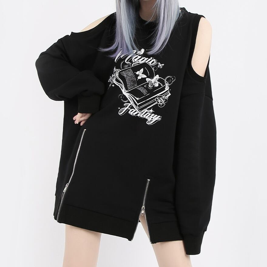 オフショルデザインに裾はダブルのZIPファスナーのトレーナー