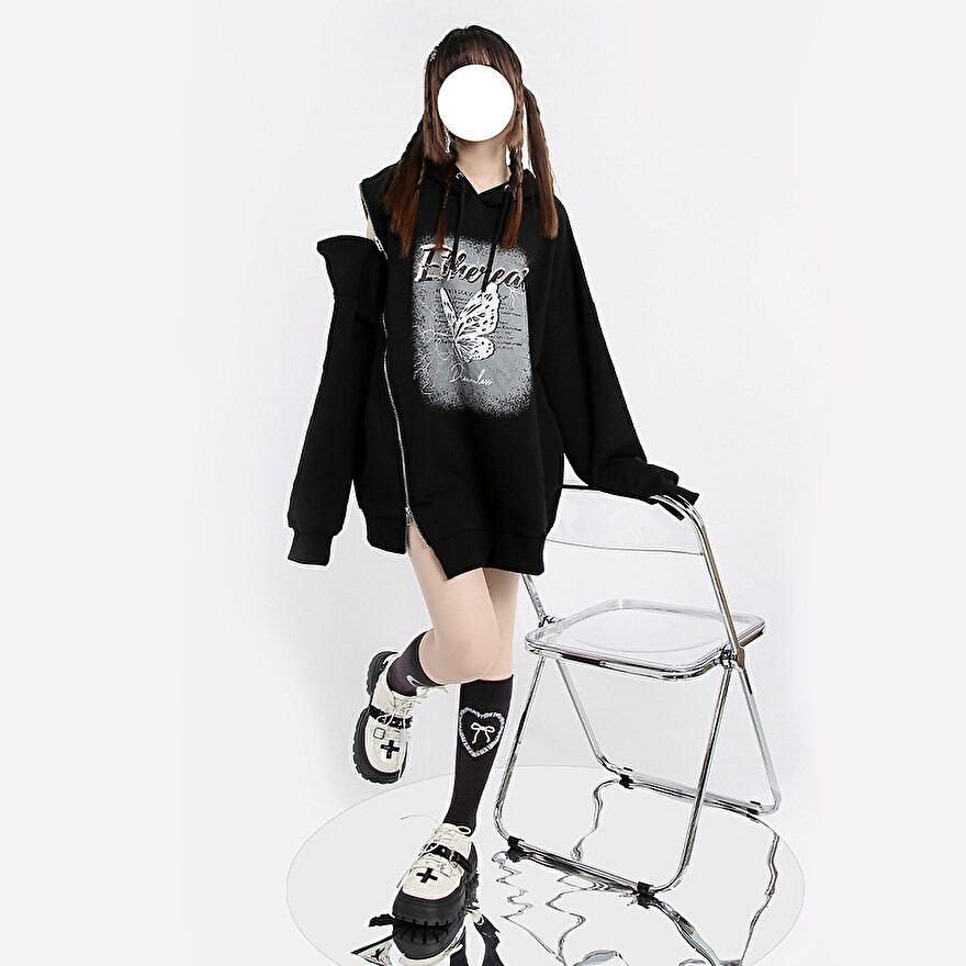 サブカル 服 地雷系 通販 Catwish ロリータ ワンショル パーカー ゆったり ロング丈 butterfly ZIPファスナー かわいい
