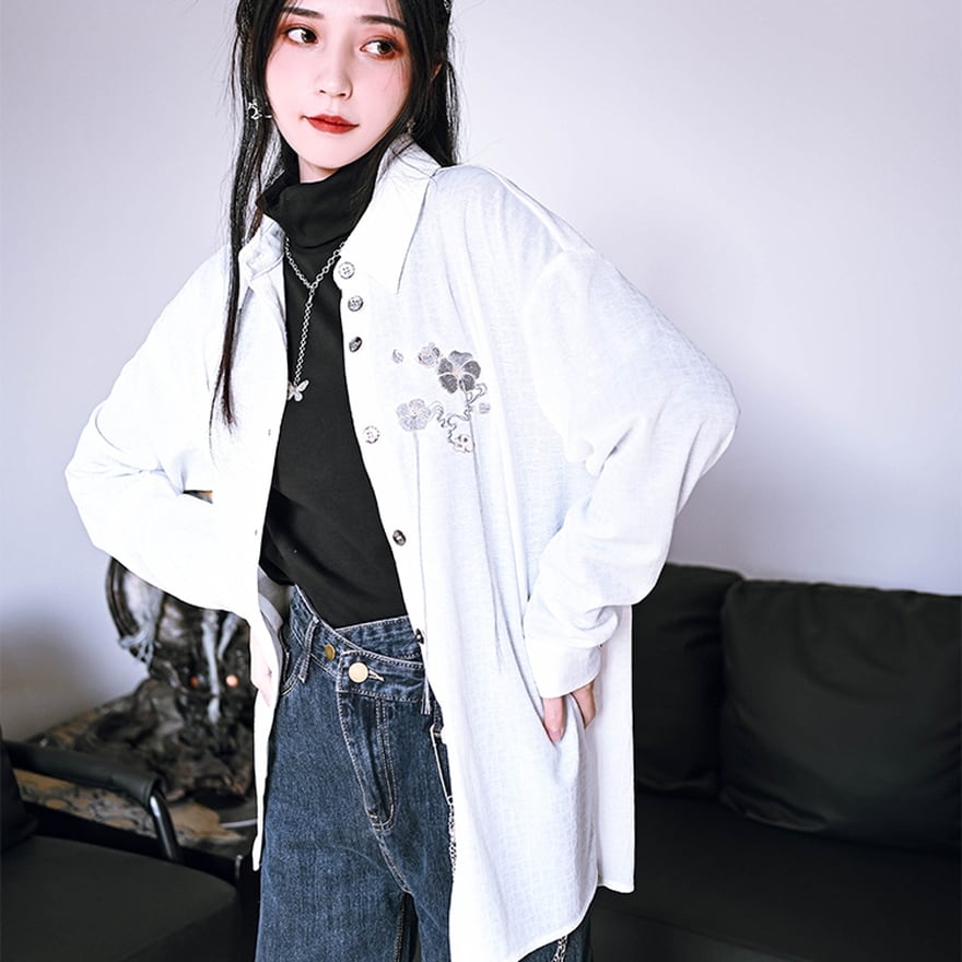 サブカル 服 地雷系 通販 チャイナ風服 チャイナ風服 古怪舎 シャツ 長袖 梅 花柄 刺繍 中華服 チャイナ服 普段使い