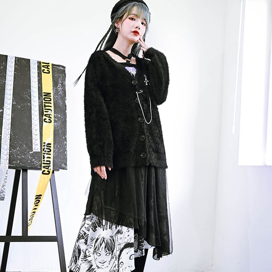 サブカル 服 地雷系 通販 チャイナ風服 チャイナ風服 古怪舎 カーディガン Vネック 長起毛 チェーン付属 ブラック グレー 闇かわいい ロリータ 普段着