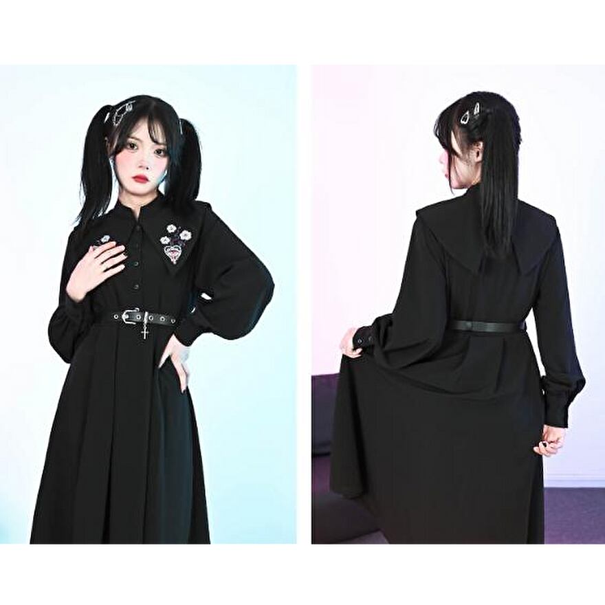 サブカル 服 地雷系 通販 チャイナ風服 チャイナ風服 古怪舎 ワンピース ベルト付き ハイウエスト 薔薇 怪物柄 ワンポイント 刺繍 闇かわいい 中華風 チャイナ服 ミドル丈 ロリータ 普段使い