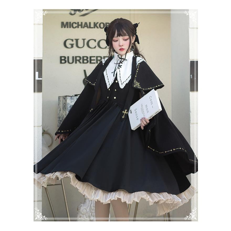 サブカル 服 地雷系 通販 アウター ロリータ マント ベスト 刺繍ベルト 十字架 ゴールド 刺繍 リボン コスプレ 衣装