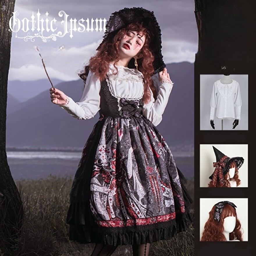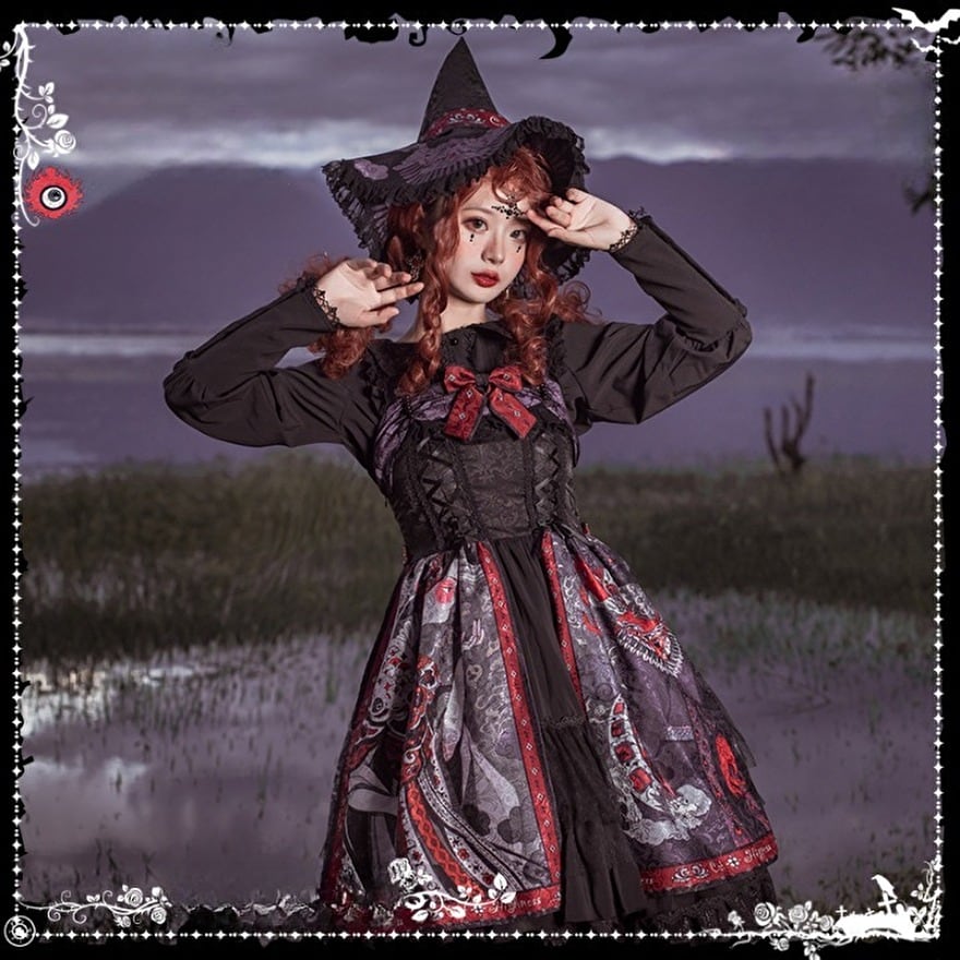 イラスト柄スカートが特徴的なゴシック系ワンピース。
