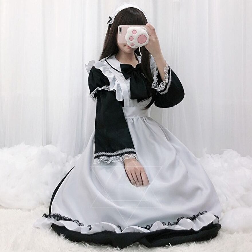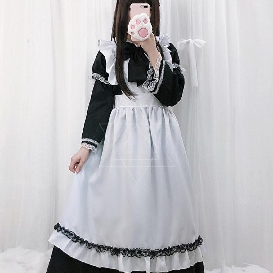 サブカル 服 地雷系 通販 ロリータ メイド服 ワンピース エプロン アクセサリー セット コスプレ 衣装 ロング丈 長袖 レース フリル リボン 秋葉原系 コンカフェ