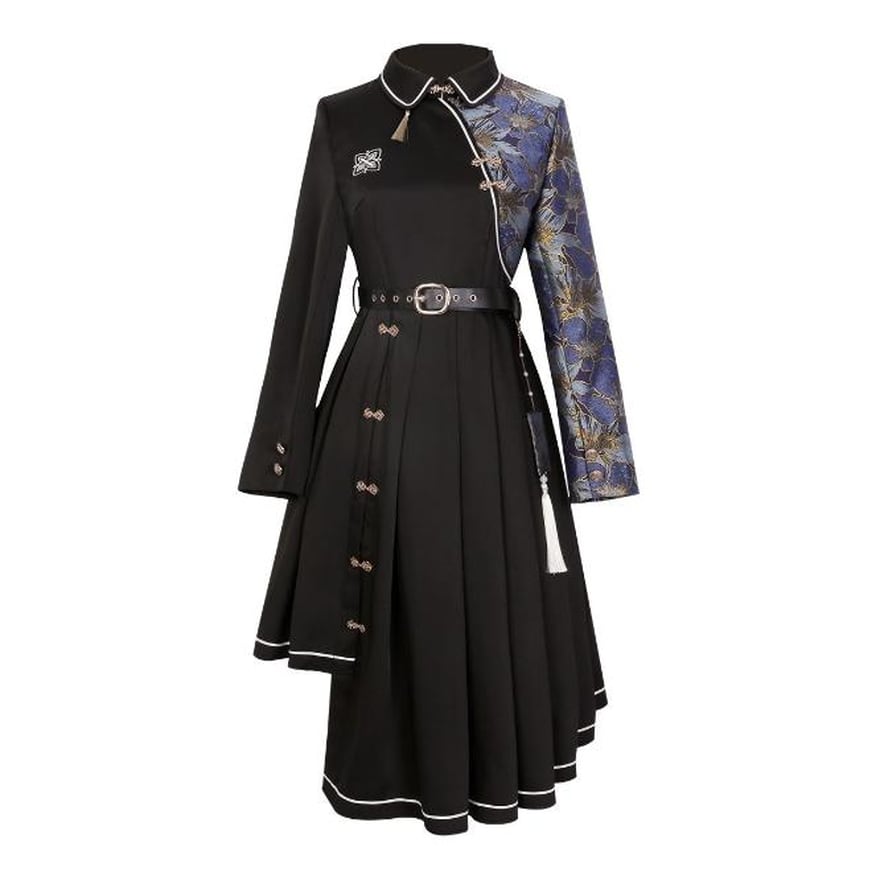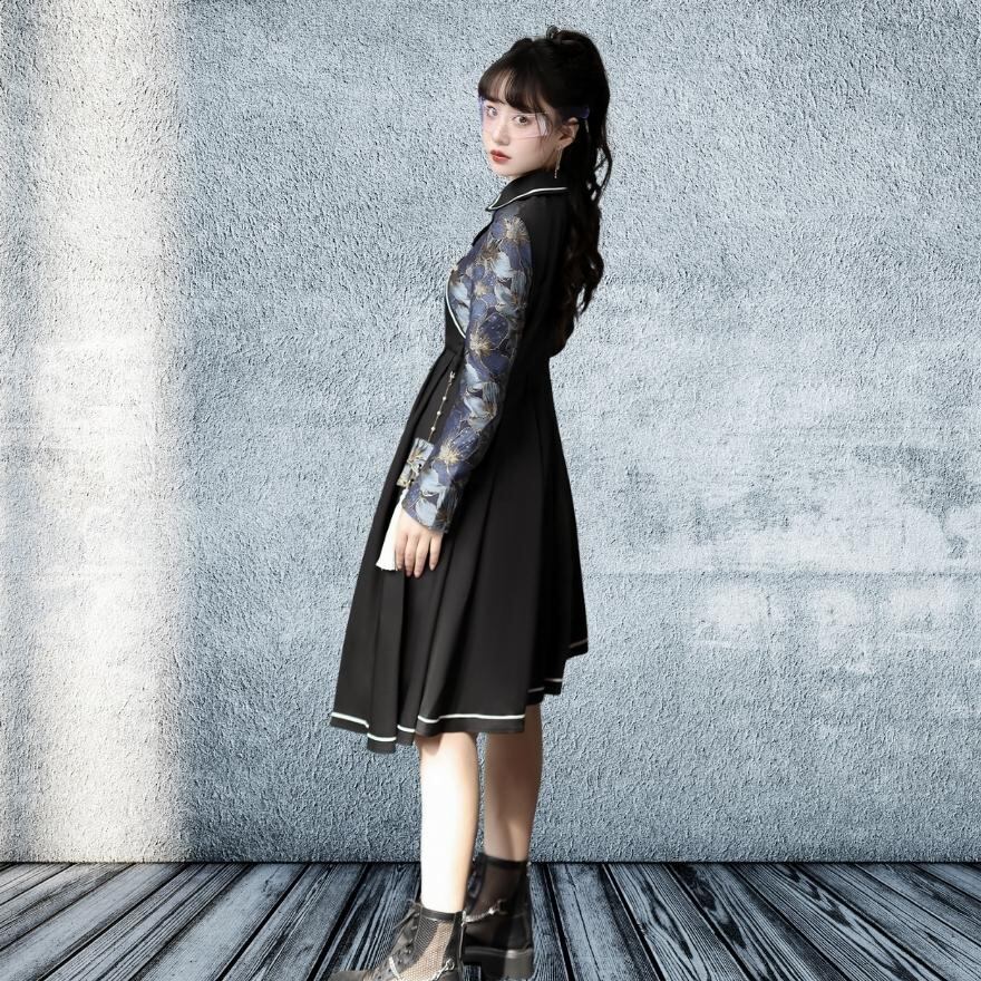 アシンメトリーなプリーツスカートに中華系花柄デザインが病み可愛い長袖ワンピースです。