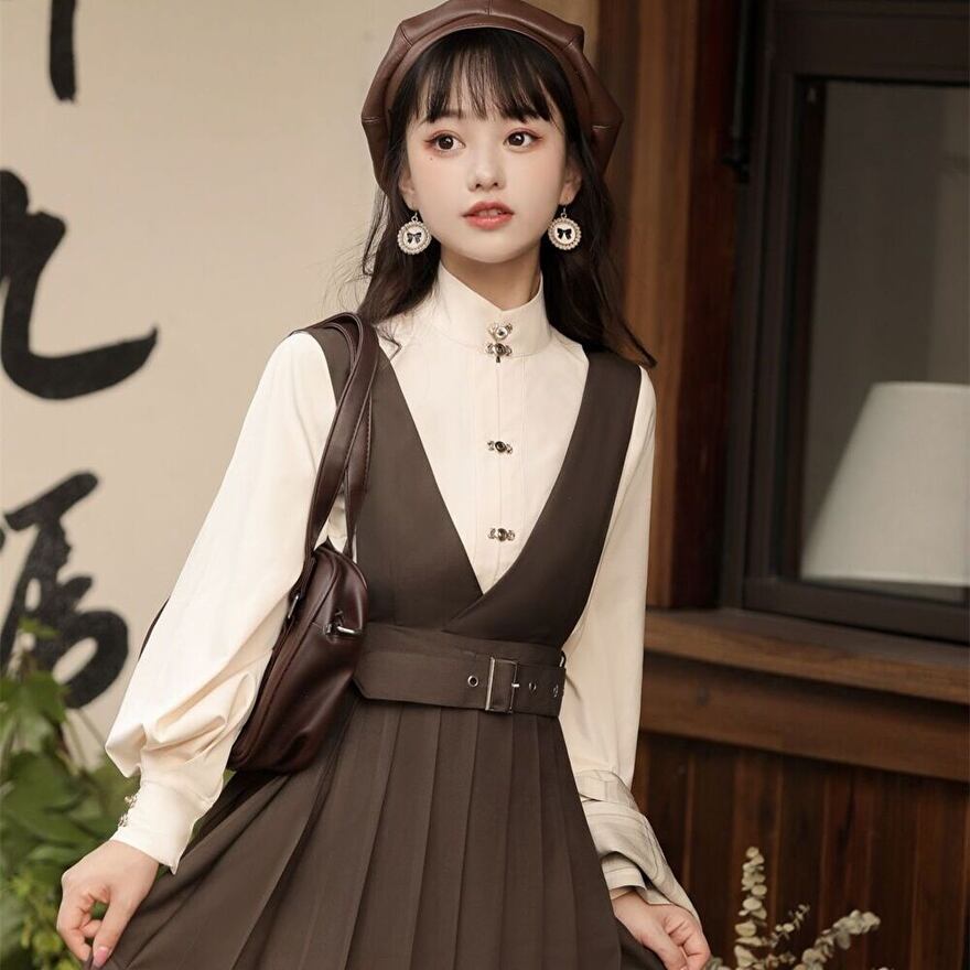 秋らしいブラウンのジャケットにダークブラウンのプリーツスカート、長袖シャツのオールインワン