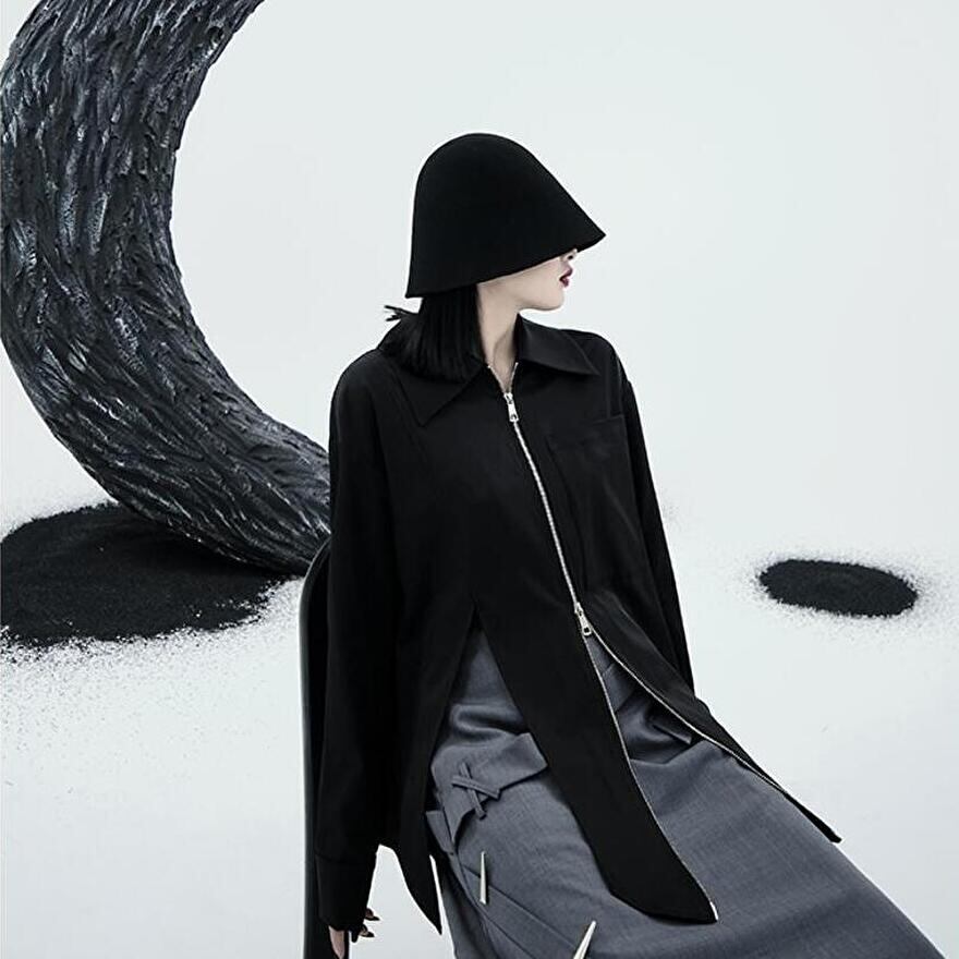 サブカル 服 地雷系 通販 異形デザイン 長袖シャツ ZIPアップ ハイスリット ロング丈 アシンメトリー スリット クール