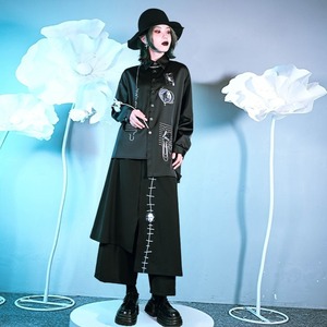 アシンメトリーなデザインにdarknessな刺繍、付属の十字架のベルトをプラスすればハイウエストなきっちりスタイルに