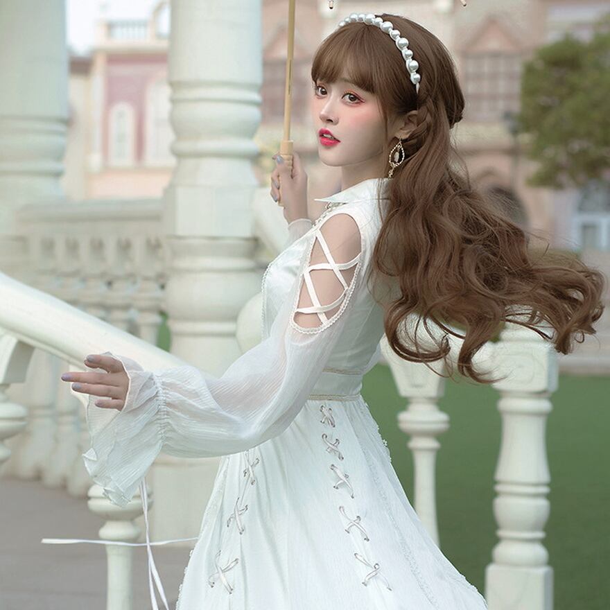 シアーな編み上げスリーブの純白ロング丈スイートロリータワンピです。