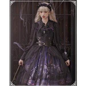darkなフレアスカートに黒のレースレイヤードが病みかわいいJSKと蝶ネクタイ付きシャツの上下4点セット割りです。