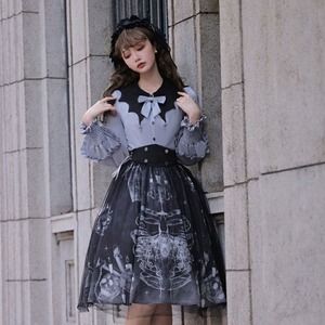 サブカル 服 地雷系 通販 上下セット ブラウス スカート バルーンスリーブ プリーツスカート レース スカル柄 エレガント おしゃれ 上品