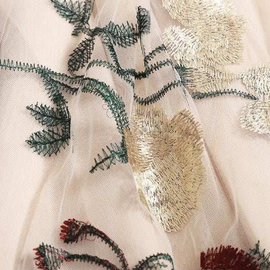 ハイウエストなAラインにベルト代わりのウエストリボン、スカートはカラフルな刺繍フラワーです。