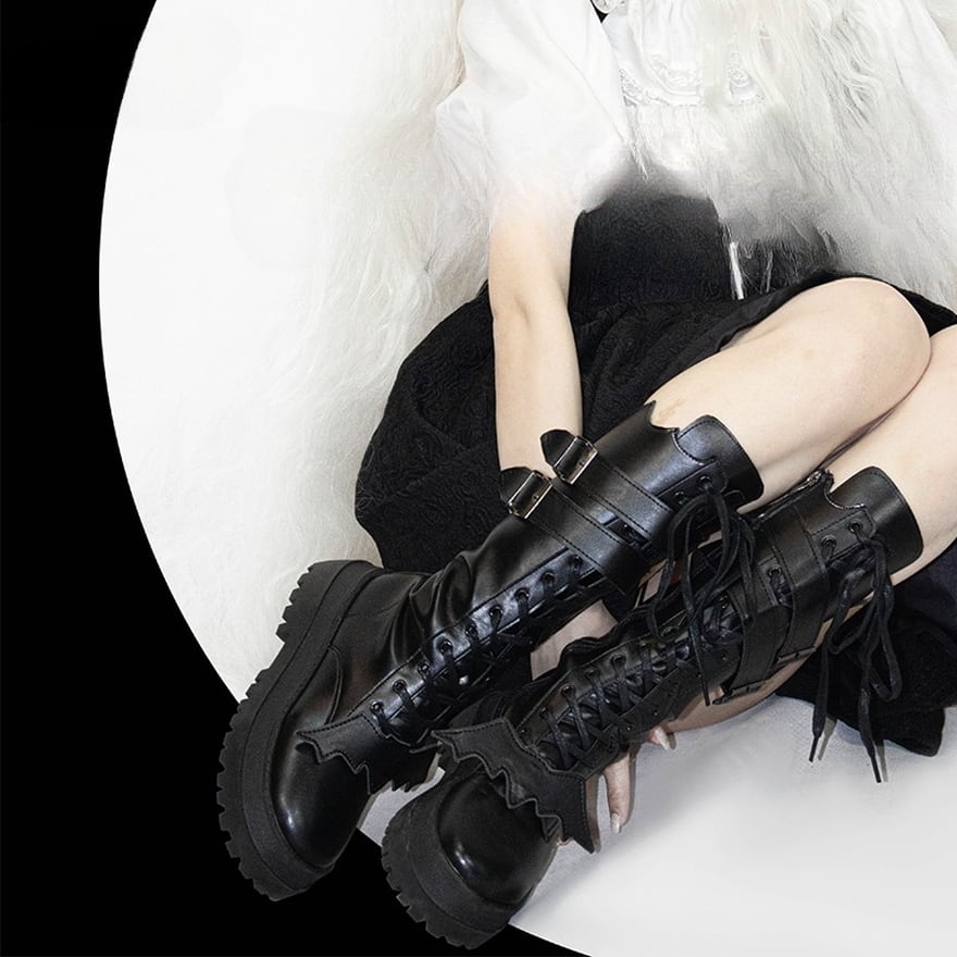 サブカル 服 地雷系 通販 ロリータ ゴスロリ ロングブーツ 選べるデザイン コウモリ バット ベルト PUレザー レースアップ 編み上げ ゴシック パンク系 ストリート系