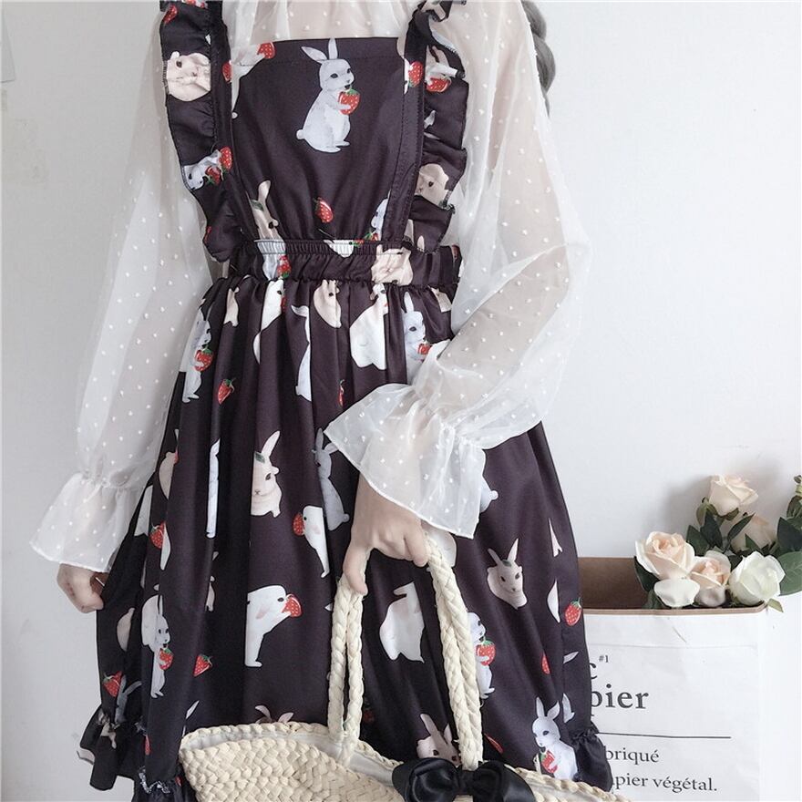 サブカル 服 地雷系 通販 ロリータ ソフトロリータ シフォン ワンピース ジャンパースカート シャツセット うさぎ ラビット いちご ストロベリー 柄 フリル 甘い かわいい ファンシー
