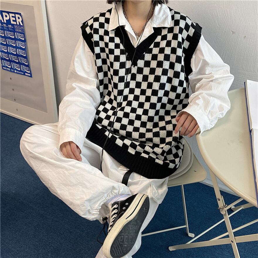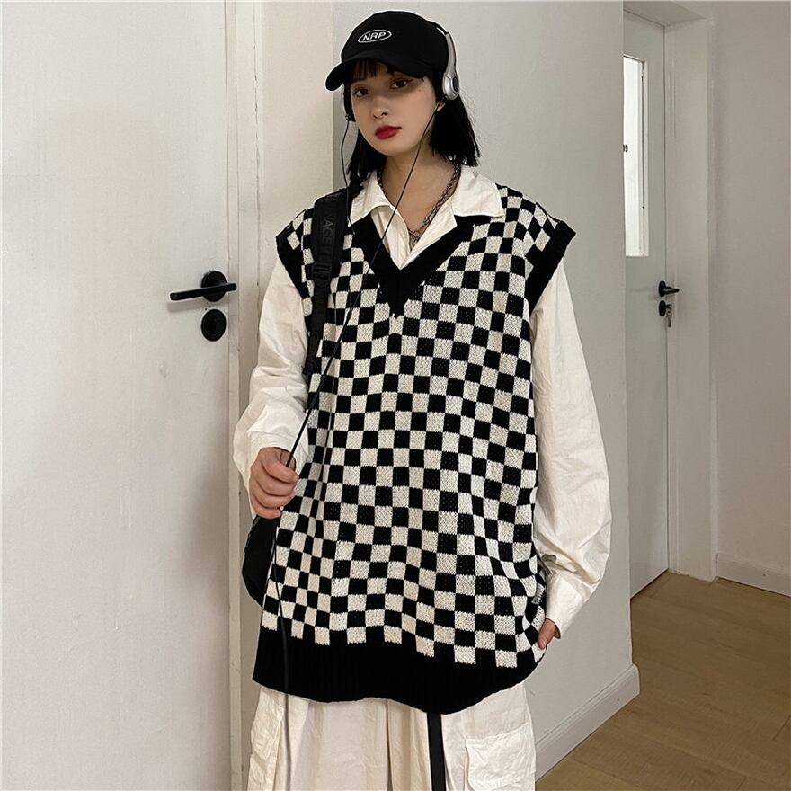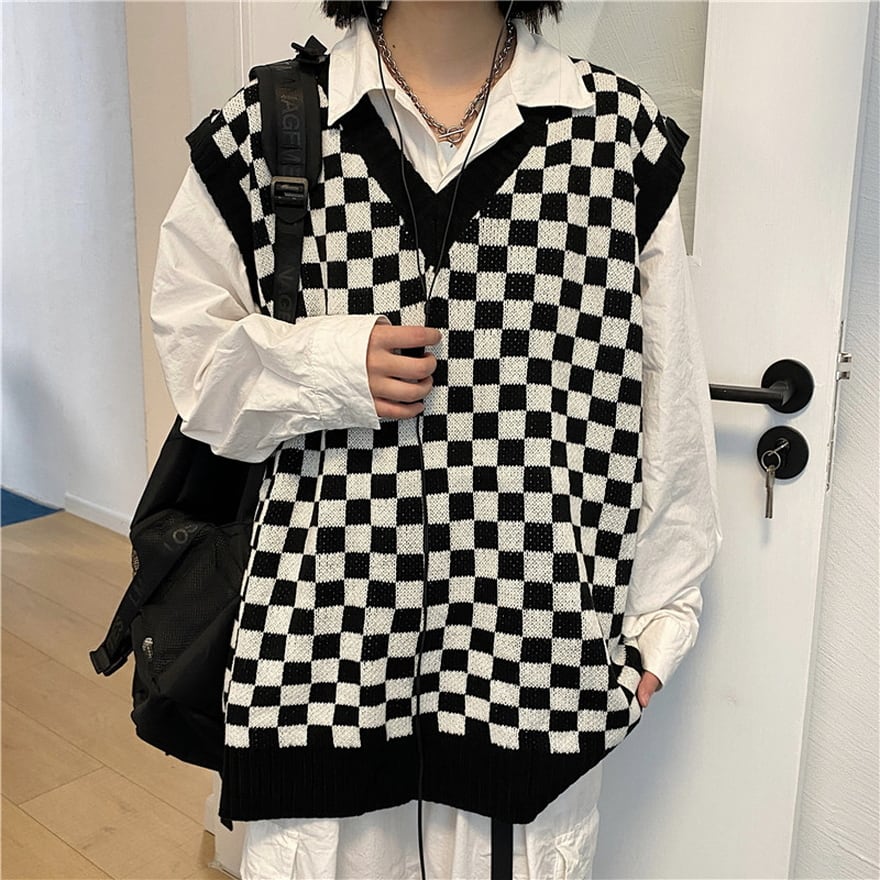 サブカル 服 地雷系 通販 V字ネック ベスト チェック柄 ユニセックス ヒップホップ