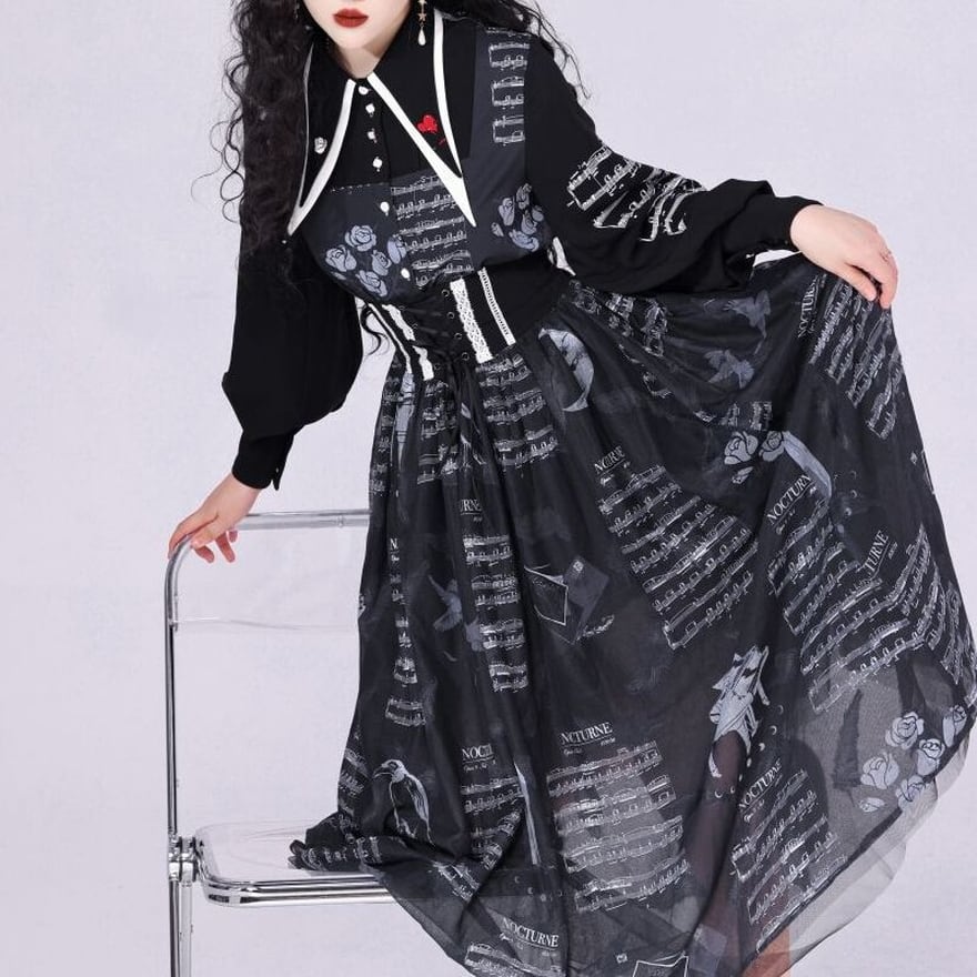 サブカル 服 地雷系 通販 ロングスカート ハイウエスト プリーツスカート 夜曲 ノクターン 音符プリント柄 大人増し 闇かわいい