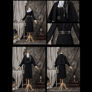 魔法学園のようなショート丈マントにブローチ、ベルト、ワンピースのフルセットです。