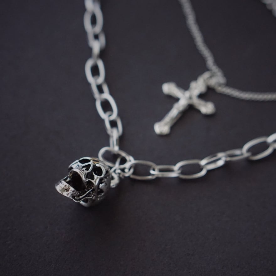 胸元のおしゃれを格上げしてくれるクロスとスカルの3連チェーンネックレスです。