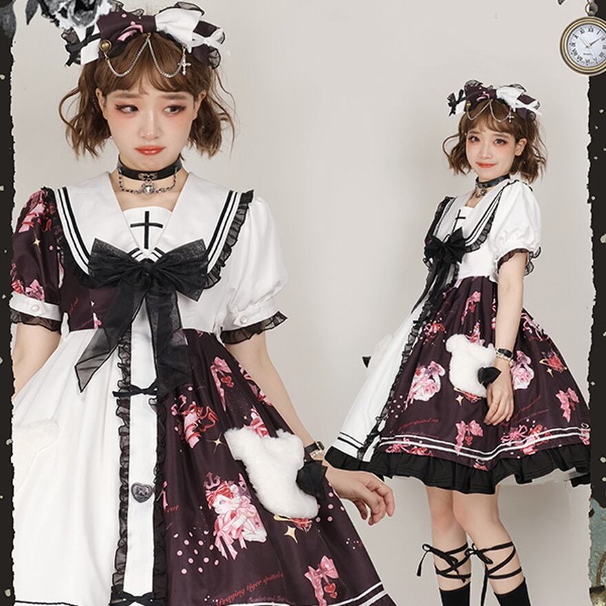 サブカル 服 地雷系 通販 ロリータワンピ アイドル ストロベリー ベア くまちゃんプリント 甘め リボン 十字架 コンカフェ イベント衣装