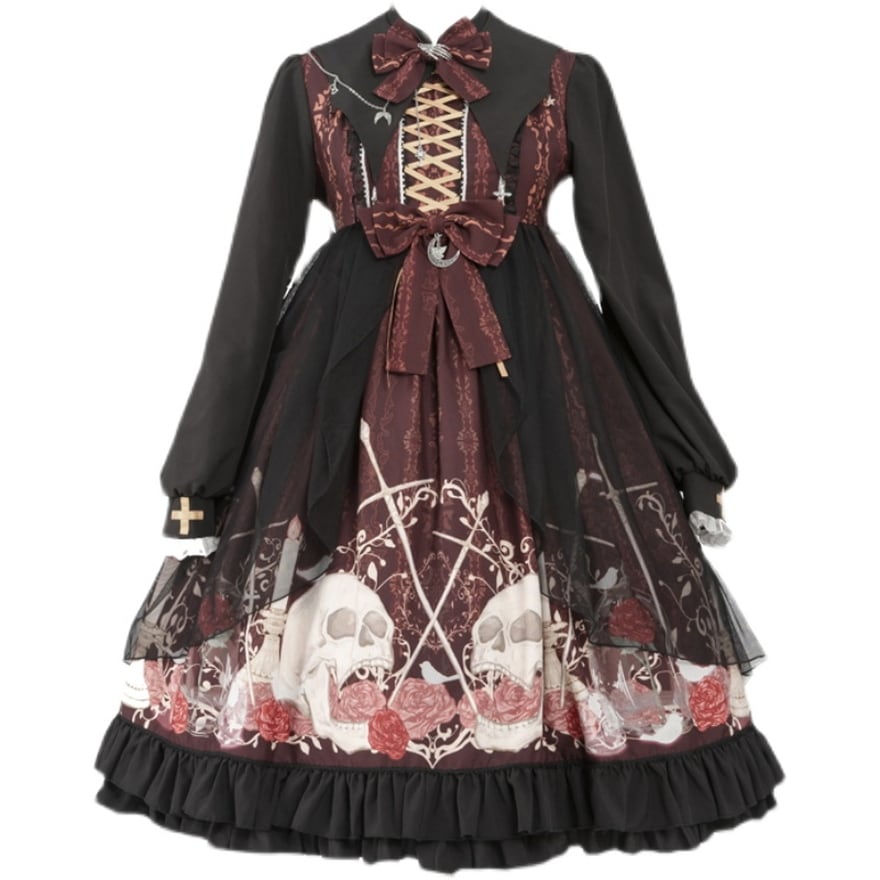 サブカル 服 地雷系 通販 ワンピース ゴシック 薔薇 スカルプリント柄 闇かわいい ハイウエスト リボン ゴスロリ