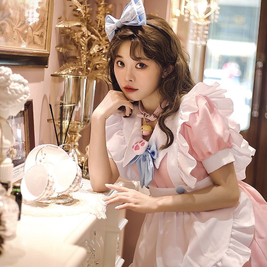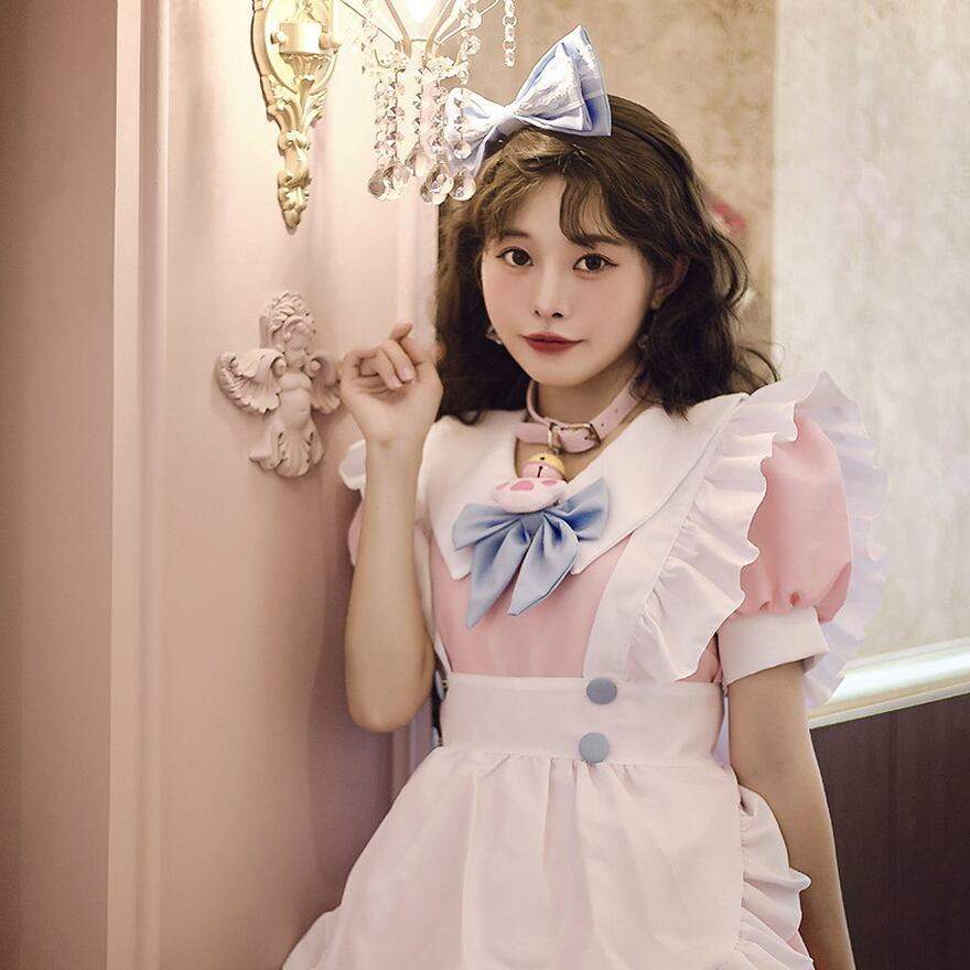 サブカル 服 地雷系 通販 ワンピ メイド服 エプロン ヘアドレス付き コスプレ ロリータ コンカフェ衣装 ピンク ブルー キャスト衣装 メイドカフェ かわいい