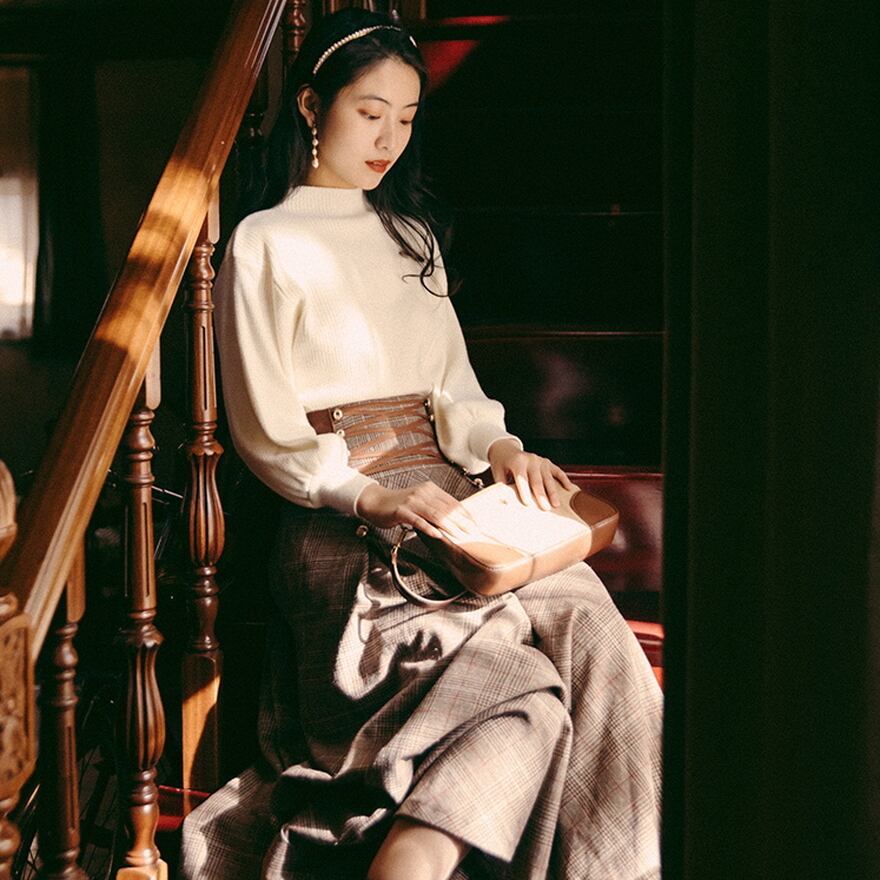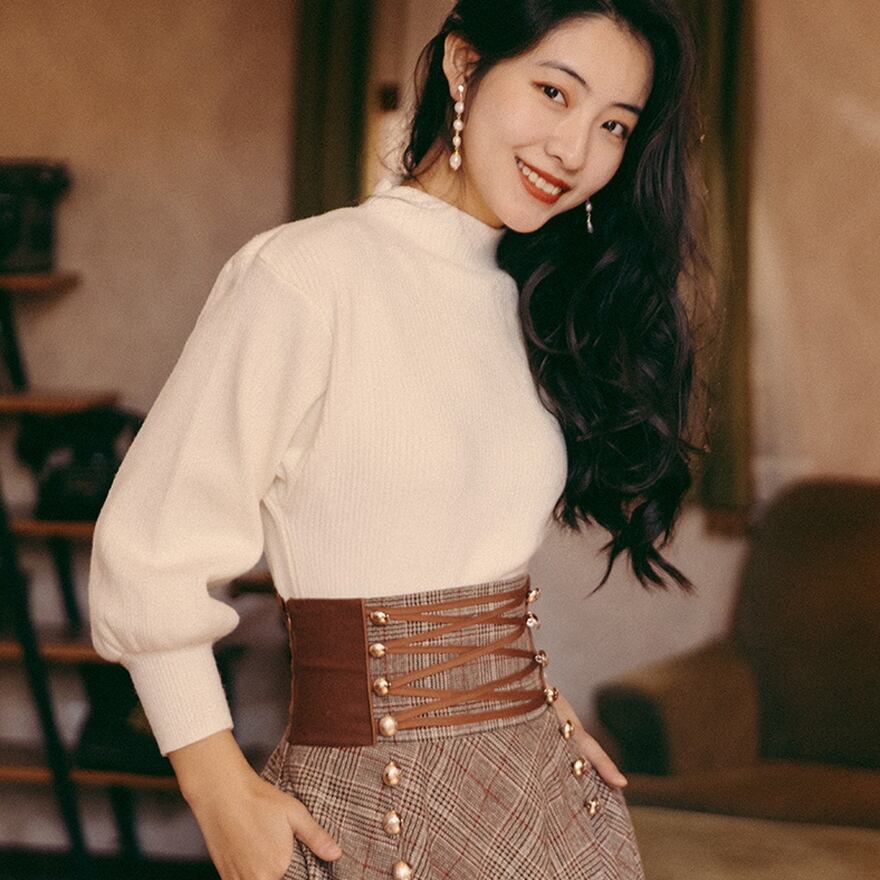大人増しなニットセーターと編み上げハイウストなアンブレラロングスカートのセットです