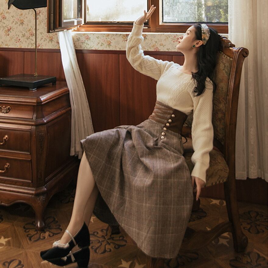 サブカル 服 地雷系 通販 ツーピース ニット セーター ロングスカート Aライン 編上げ レトロ チェック柄 大人増し きれいめ