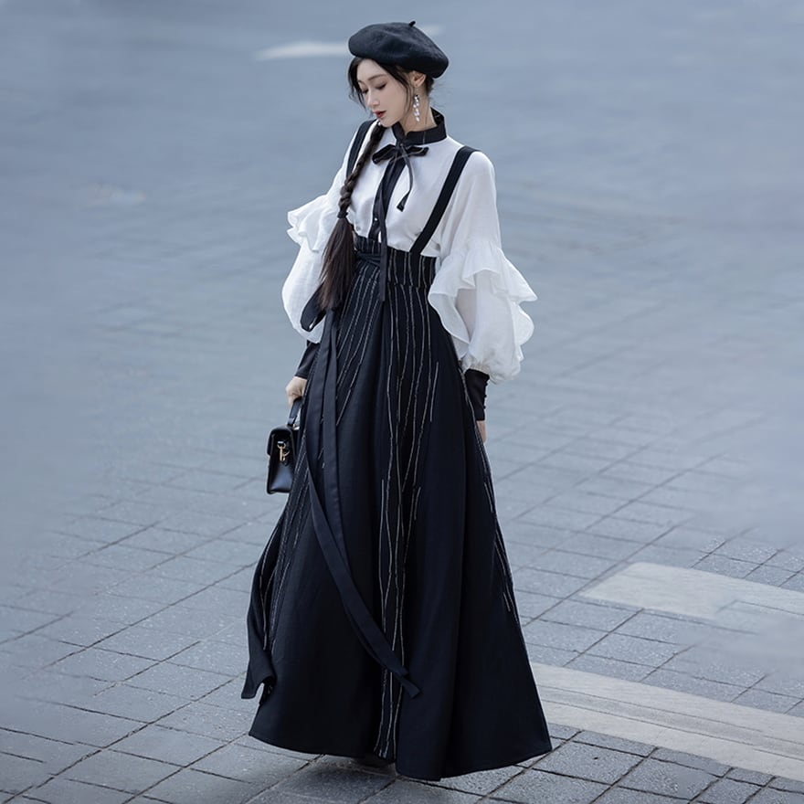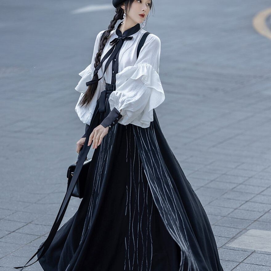 白黒のコントラストにチャイナ風のスタンドカラー、ネックリボンが大人可愛い