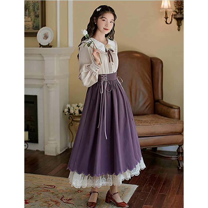 サブカル 服 地雷系 通販 ツーピース 長袖ブラウス レースアップ ロングスカート レトロ クラロリ クラシカルロリィタ フレンチロリータ 上品 清楚 甘め かわいい