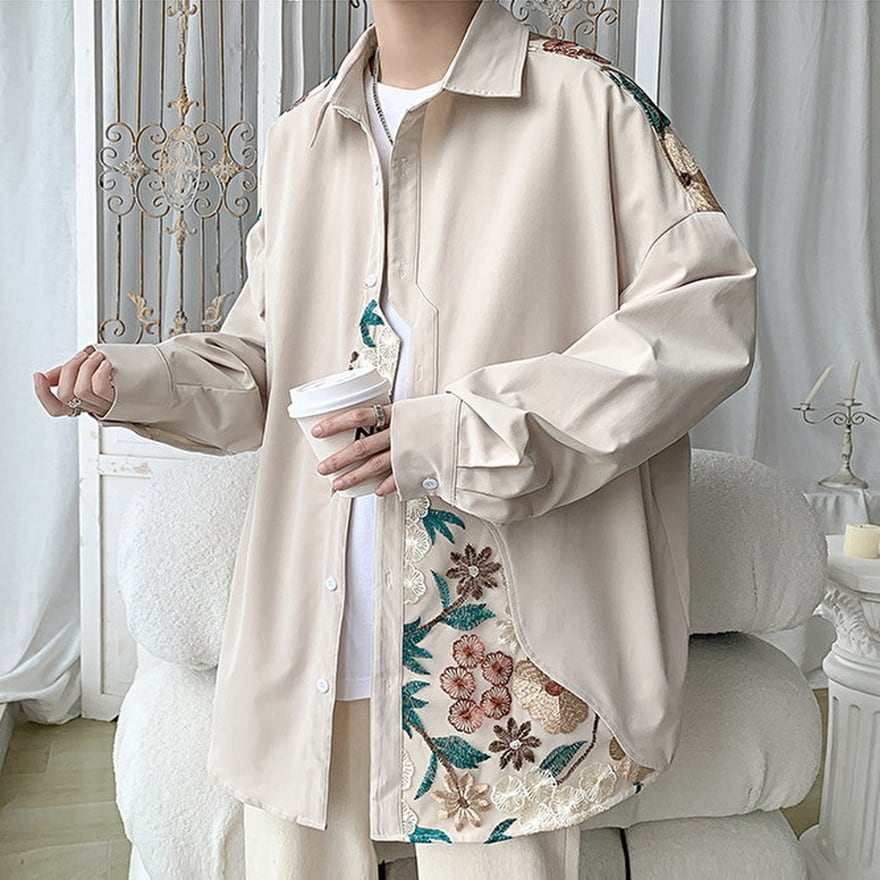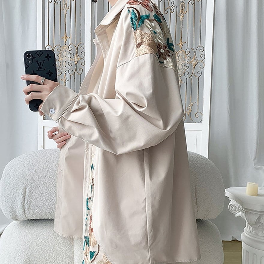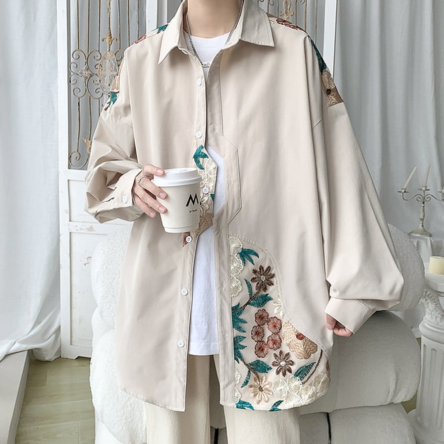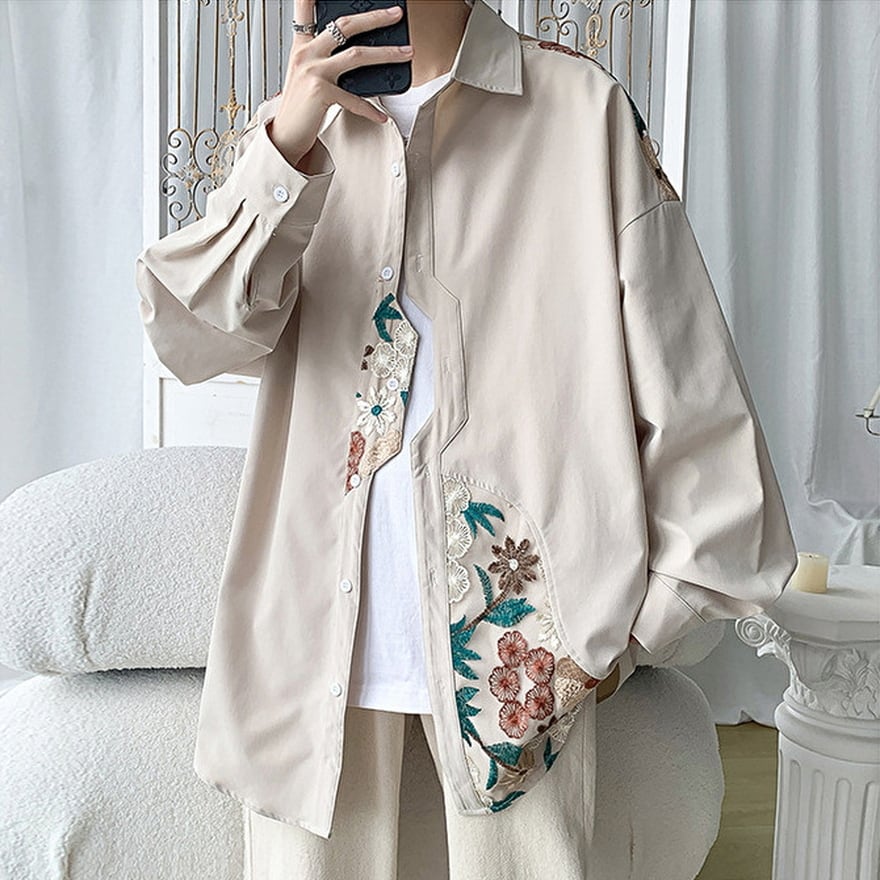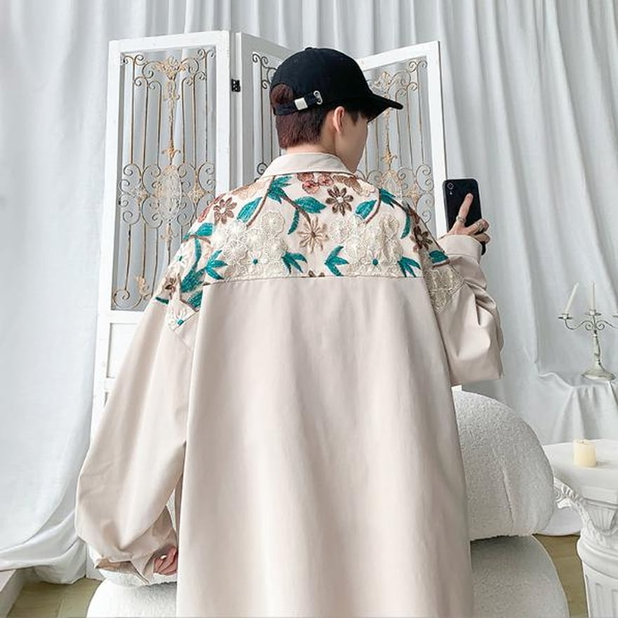 サブカル 服 地雷系 通販 メンズ シャツ 刺繍 花柄 カジュアル オーバーサイズ ファッションチャイナ服