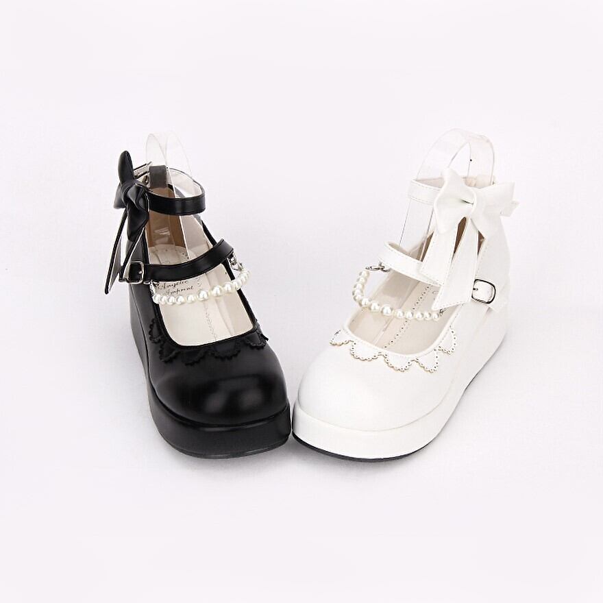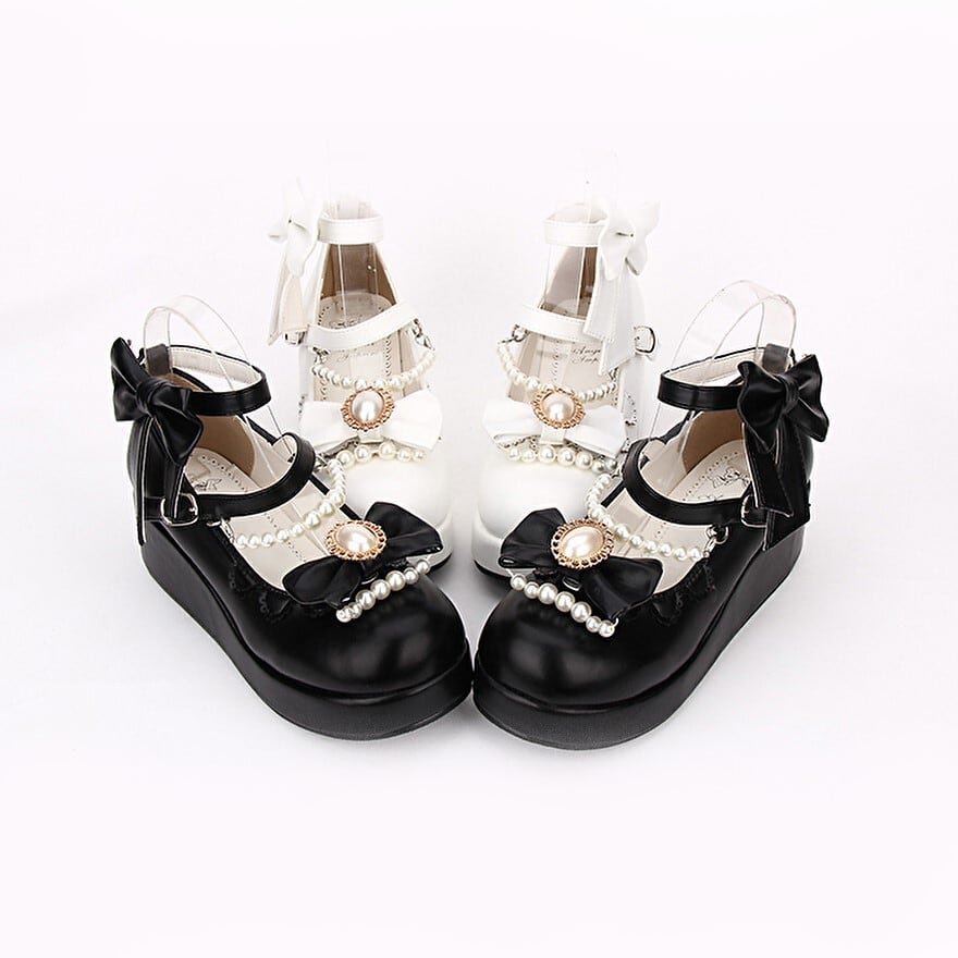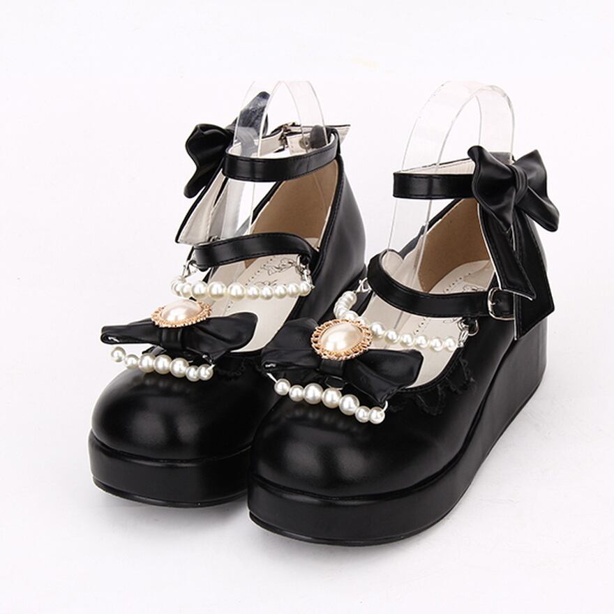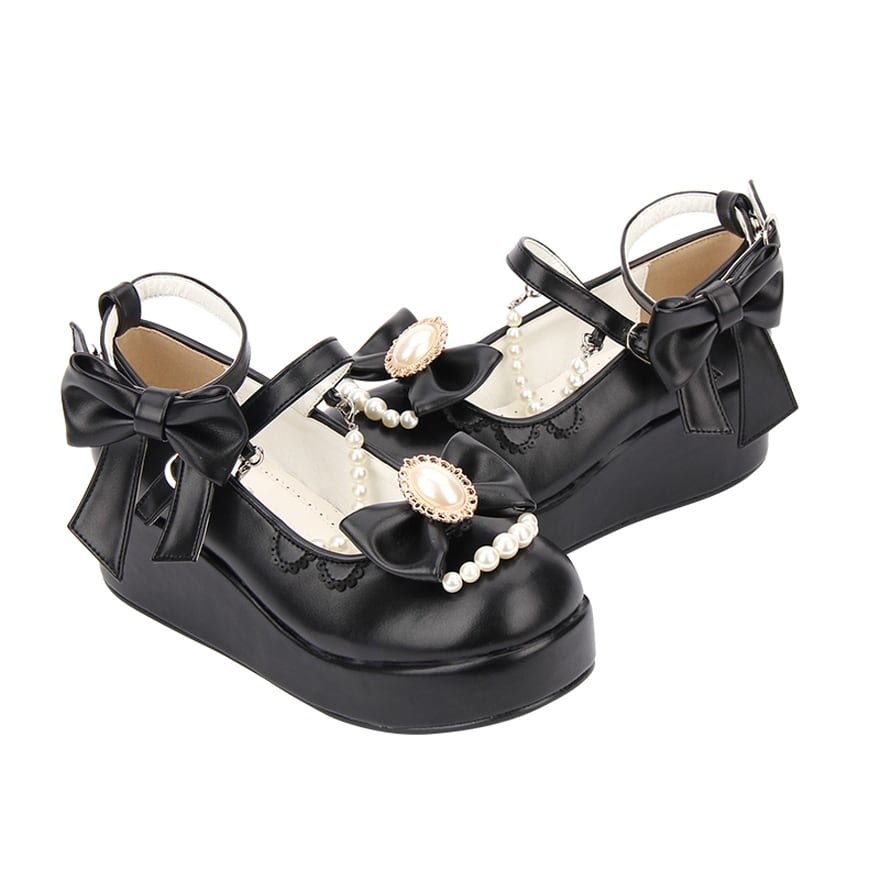 サブカル 服 地雷系 通販 厚底パンプス ロリータ靴 リボン フェイクパール 上品 お嬢様 ヒール5cm 可愛い
