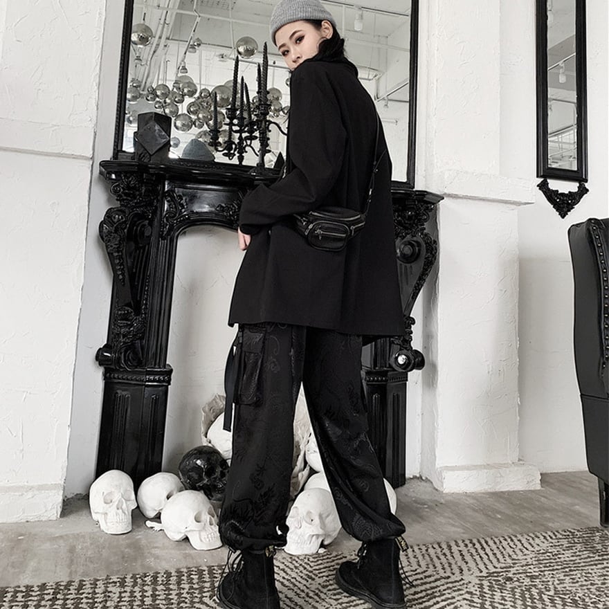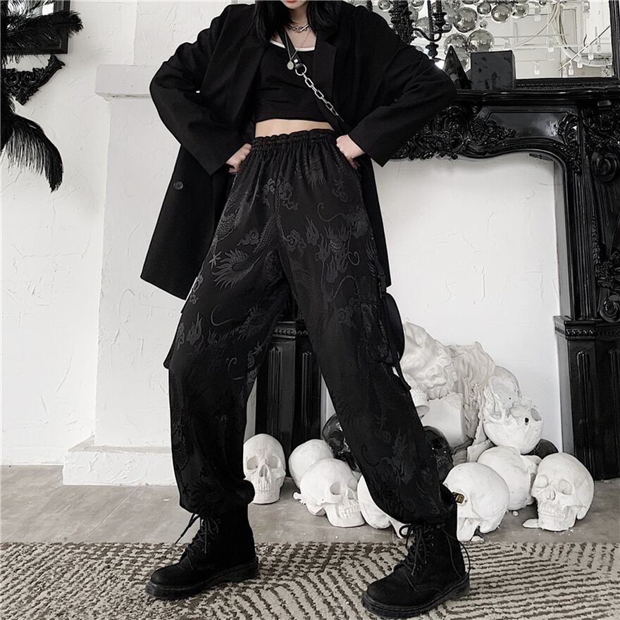 サブカル 服 地雷系 通販 パンツ ドラゴン柄 マットブラック イージーパンツ 闇かわいい ヒップホップ