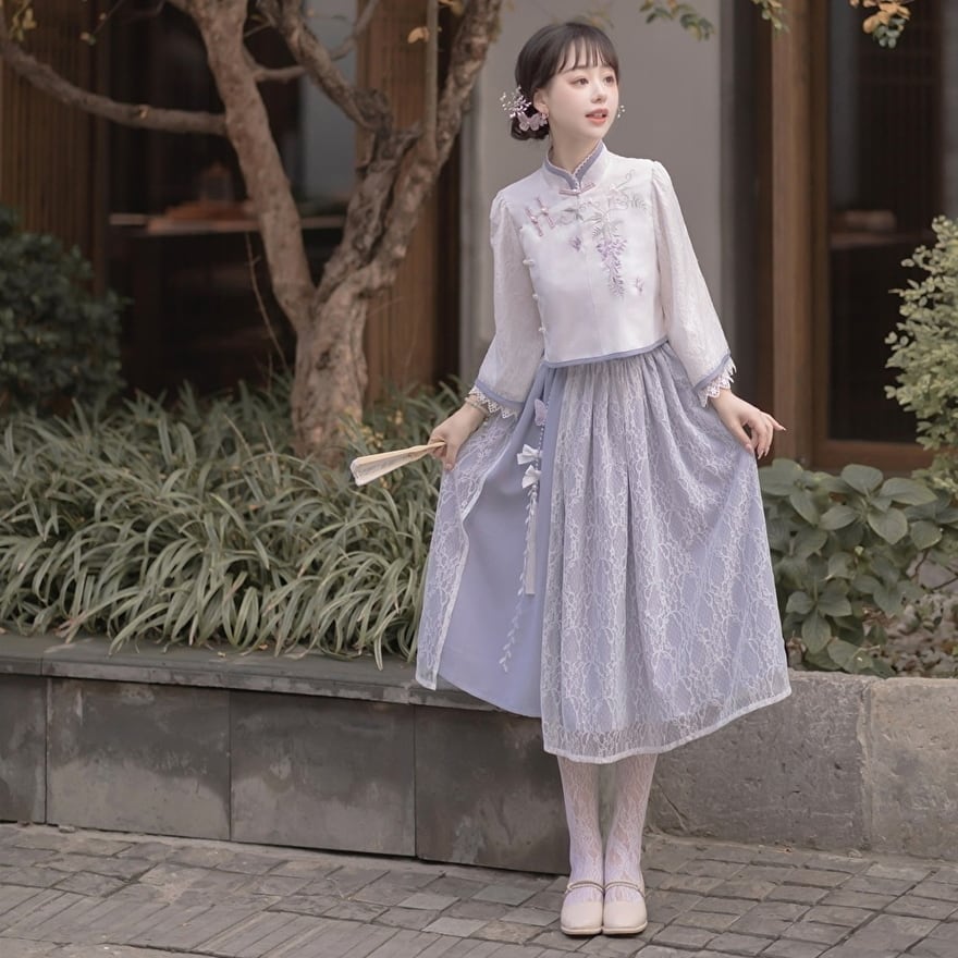 チャイナ服らしいスタンドカラーに藤の花の刺繍、スカートはタッセル付きのレースレイヤードがおしゃれ