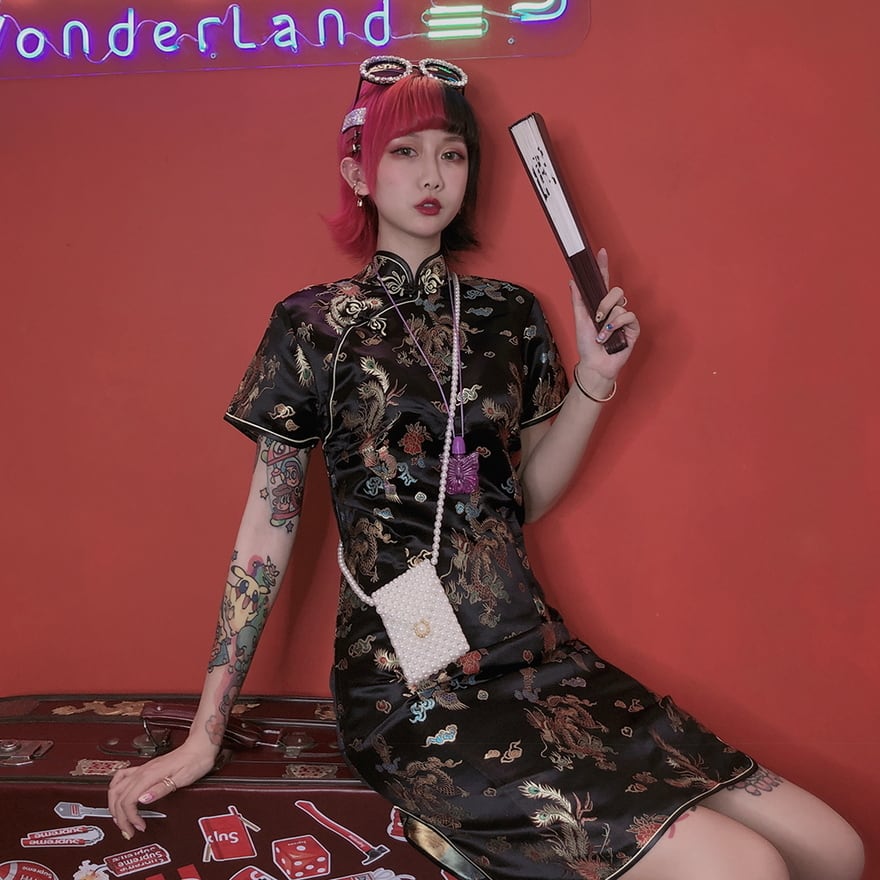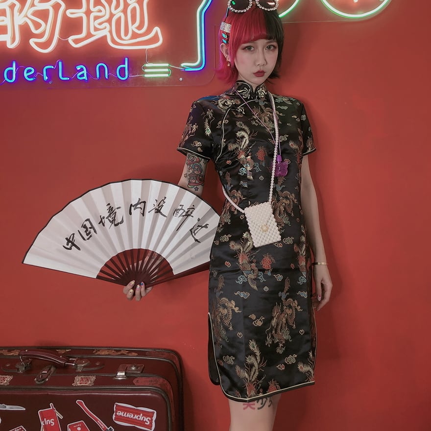 サブカル 服 地雷系 通販 FANLOVE チャイナ服 レトロ ドラゴン 刺繍 ミニドレス コンカフェ イベント衣装 バンギャ