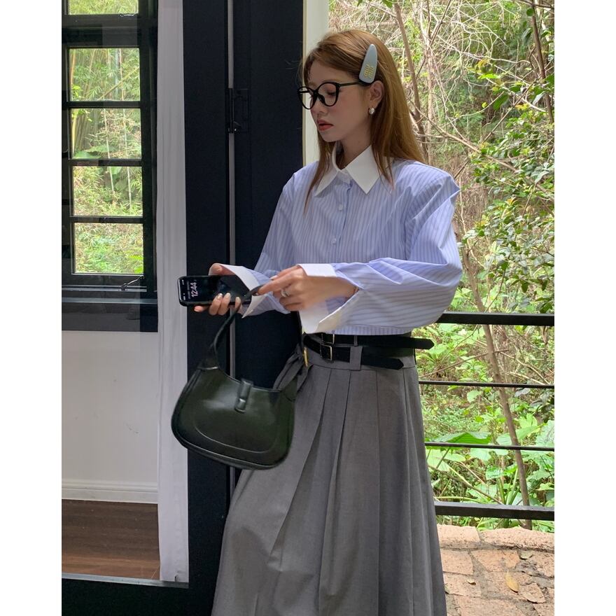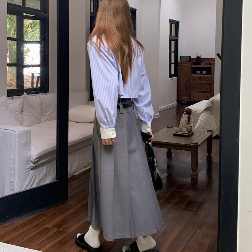 ウエストのダブルベルトがかっこいい韓国ファッション系のプリーツロングスカートです。