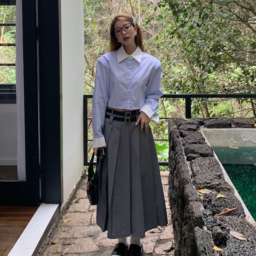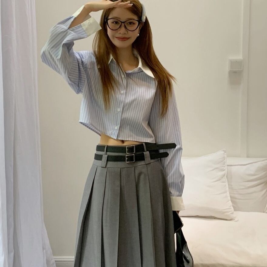 清涼感のあるストライプ柄がかっこいい韓国ファッション系長袖シャツです。