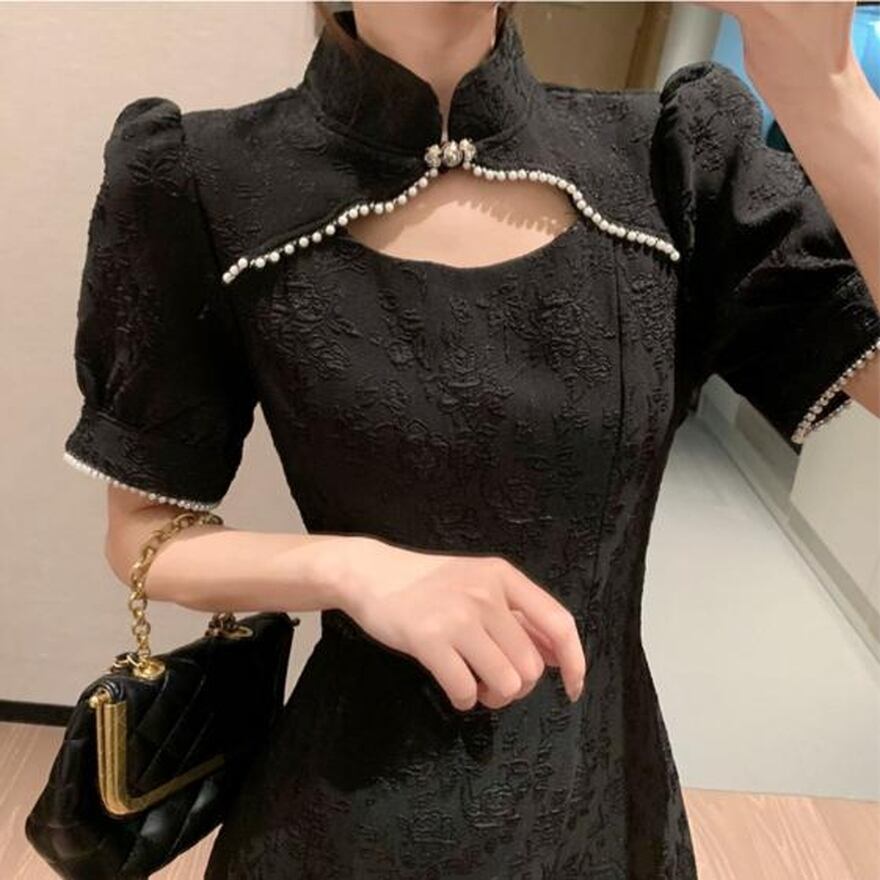 デコルテを美しく見せてくれるスタンドカラーのミニ丈チャイナドレスです