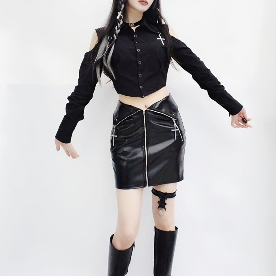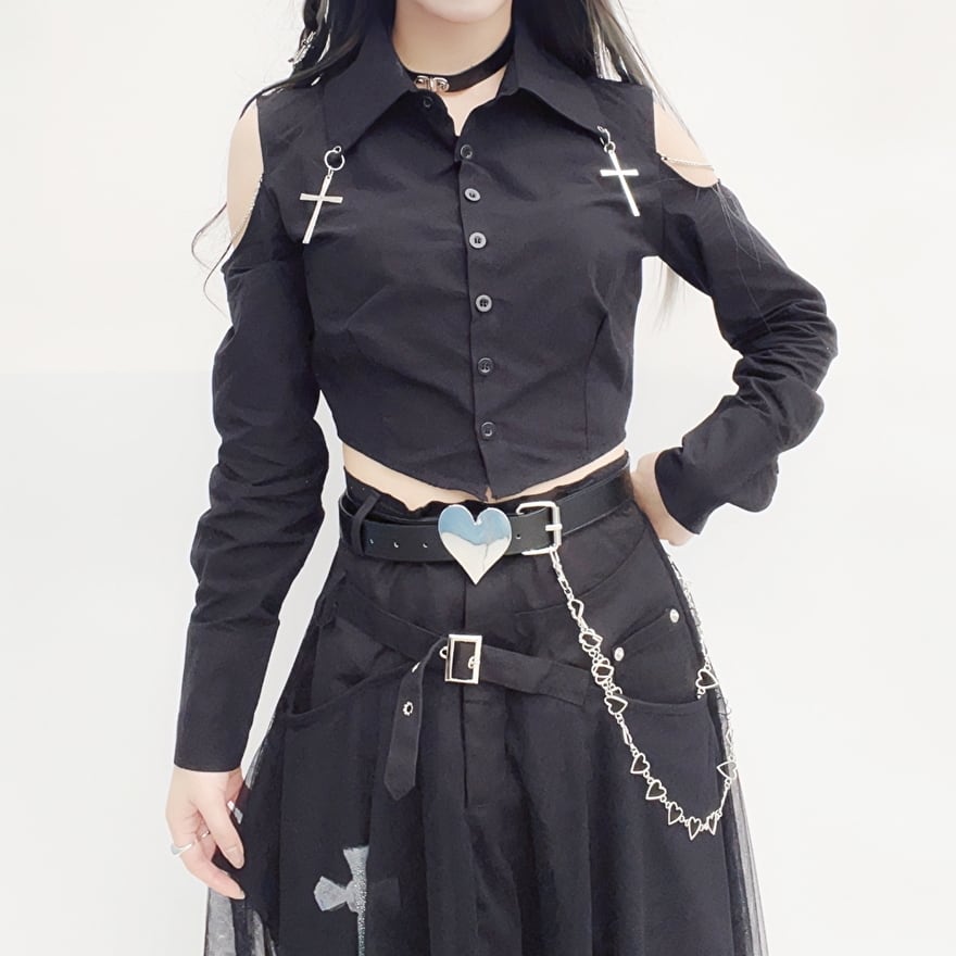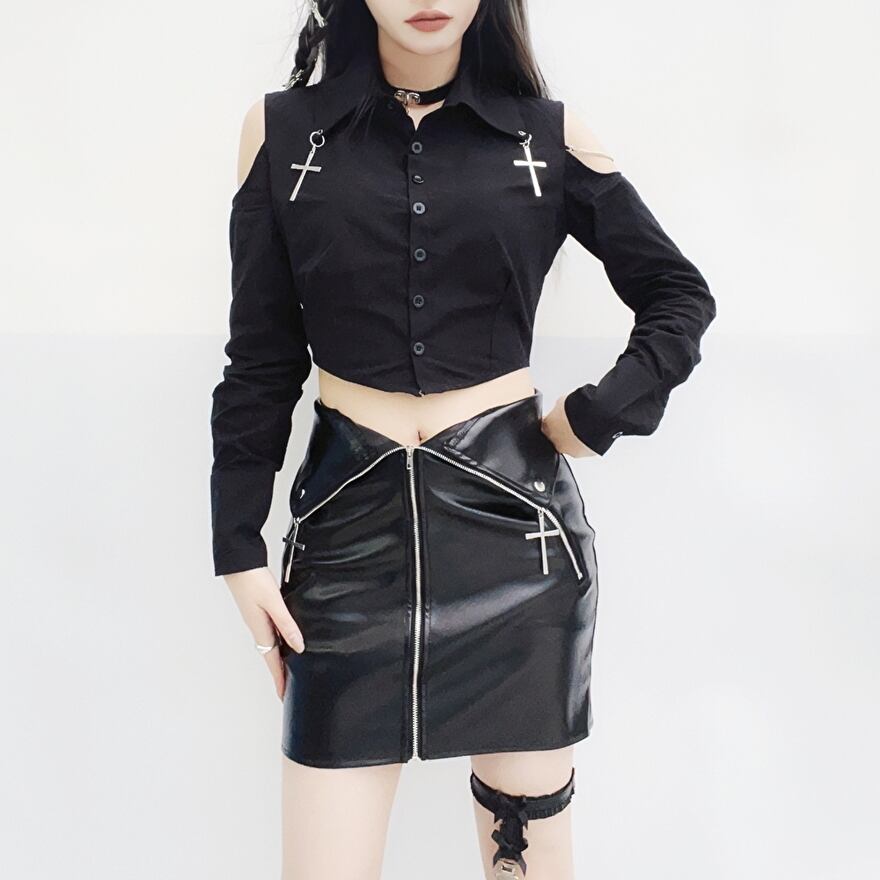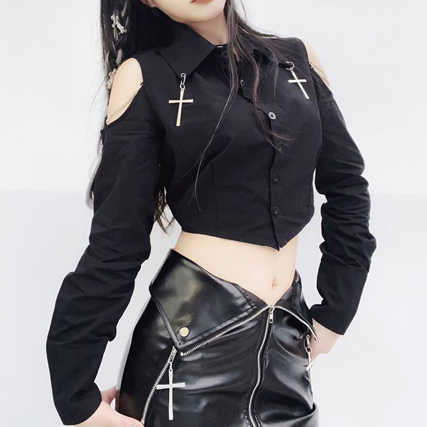 サブカル 服 地雷系 通販 Miub オフショル ショート丈 シャツ クロス 十字架 闇かわいい 暗黒系 女子 バンギャ