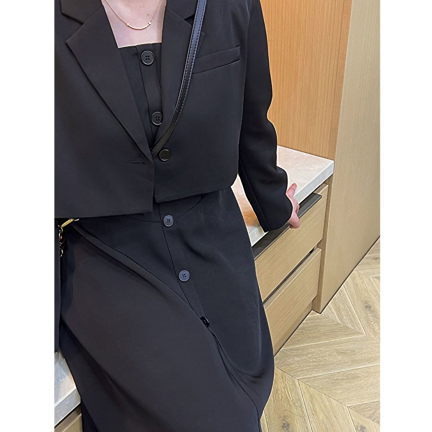 スッキリとした腰高デザインのJSKにきっちり感のあるショート丈ジャケットのスーツです。