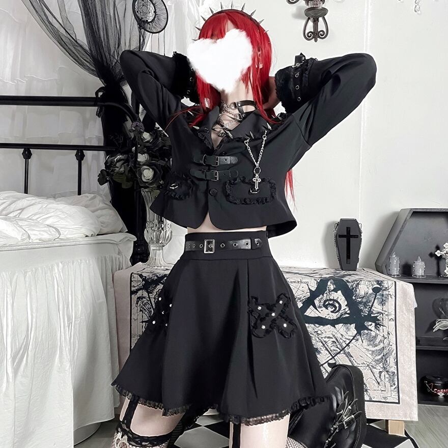 天使と悪魔 サブカル系 ハードゴシックなレザーストラップベルトのジャケットとミニスカのセットアップ