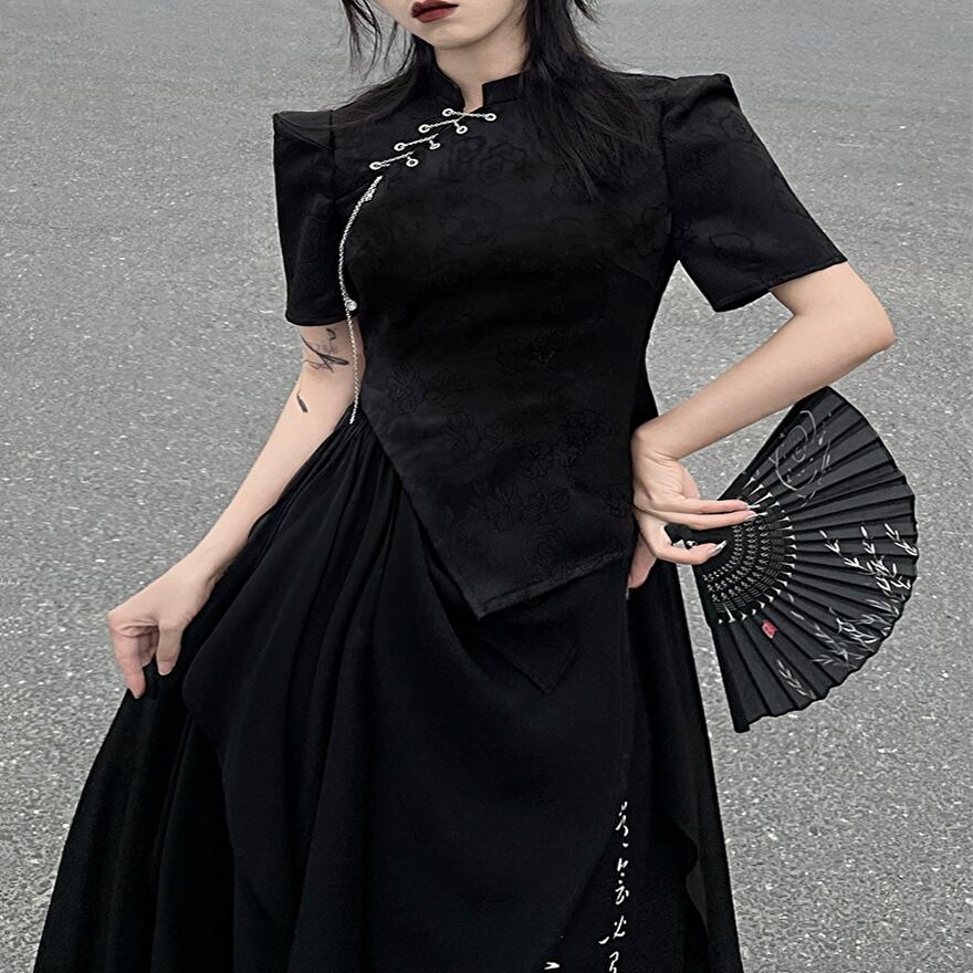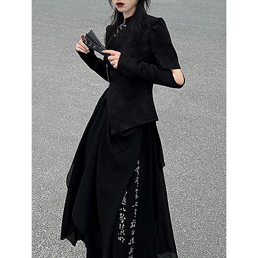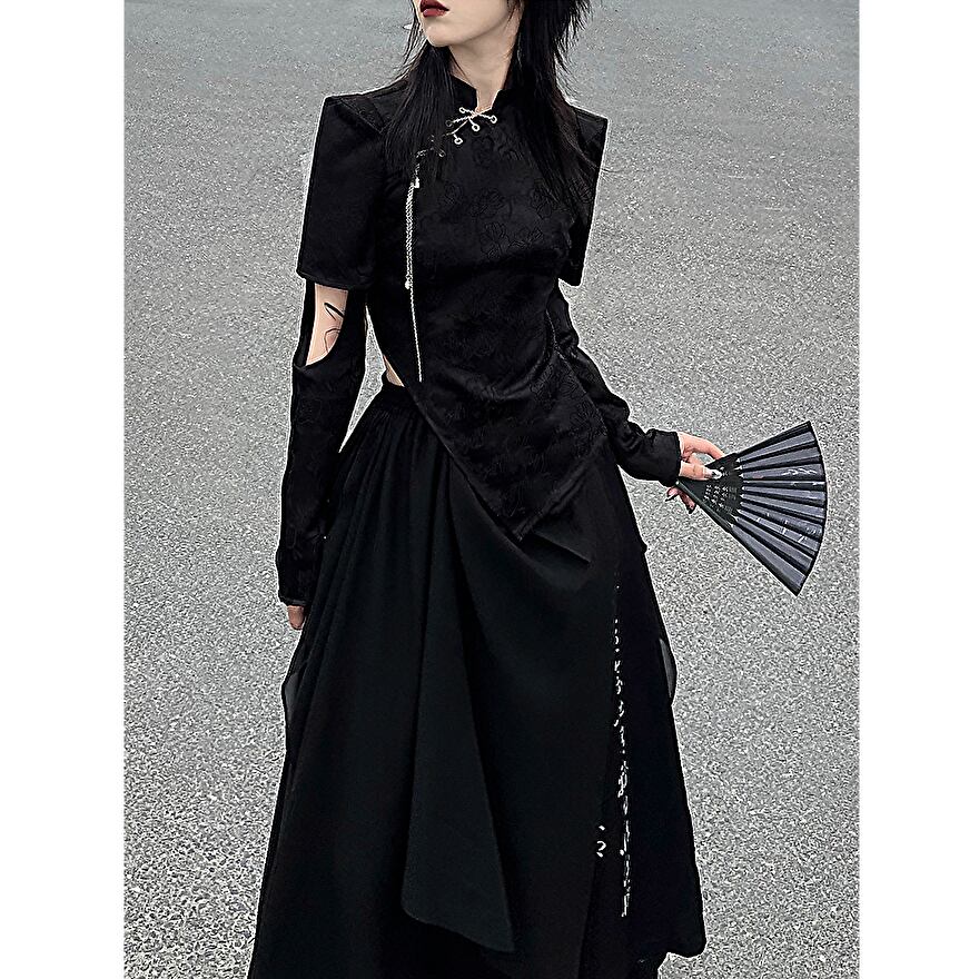 サブカル 服 地雷系 通販 ブランド 云?斜簪かんざし セットアップ シャツ 斜め 編み上げ 取り外し可能 スリーブ アシンメトリー スカート 花柄刺繍 豪華 チャイナ風チャイナ服 闇かわいい ゴシック 大人ゴシック