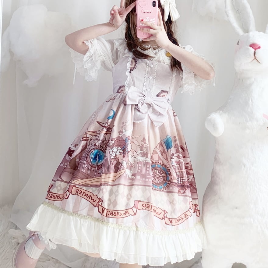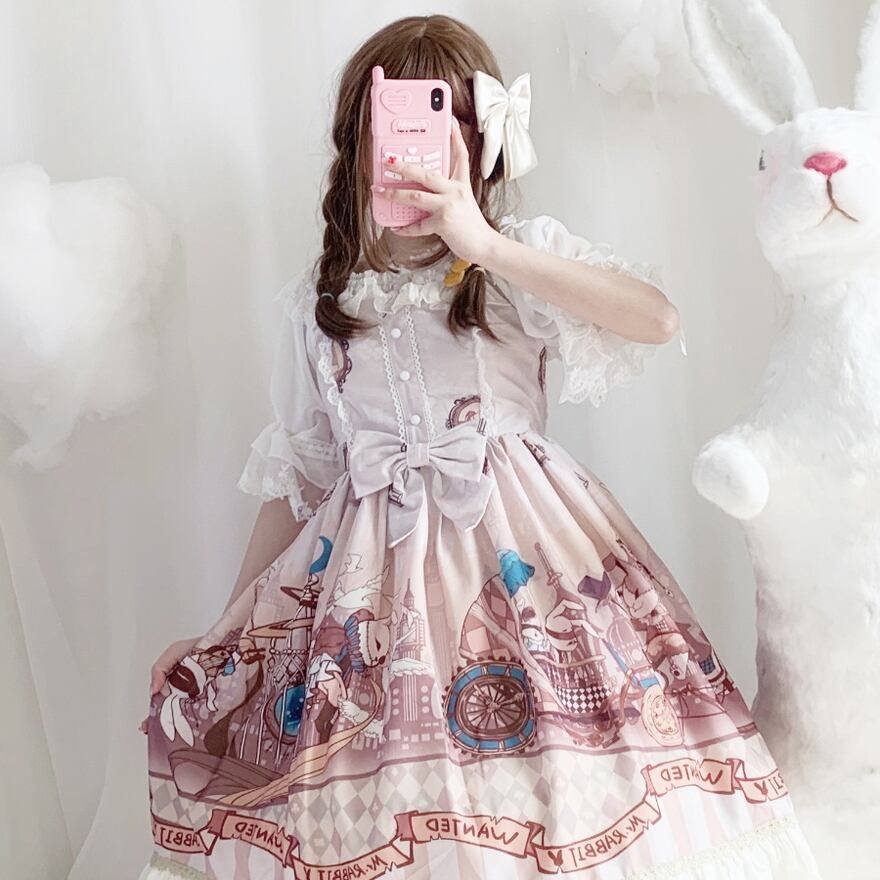 サブカル 服 地雷系 通販 ロリータ 梦梦の工作室シリーズ スイートロリータ ワンピ ファンシー ロマンティック かわいい パペット柄 ウエストリボン