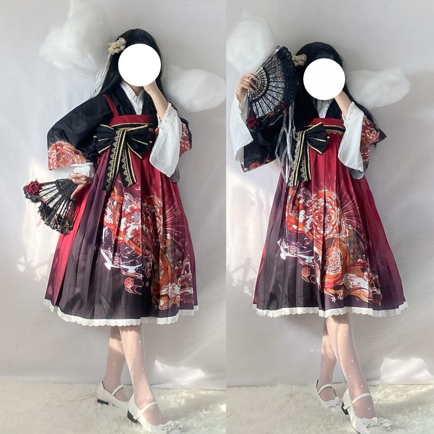 サブカル 服 地雷系 通販 ロリータ 梦梦の工作室シリーズ 華ロリ セットアップ 3点セット アウター ワンピ インナー チャイナ風 プリーツスカート トランペットスリーブ 着物風