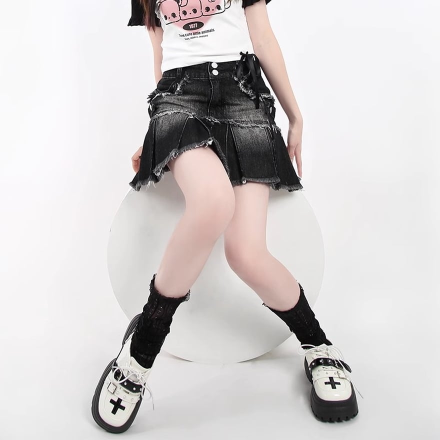 サブカル 服 地雷系 通販 Catwish ミニスカ デニム 切りっ放し ダメージデニム プリーツ ソフトロリータ