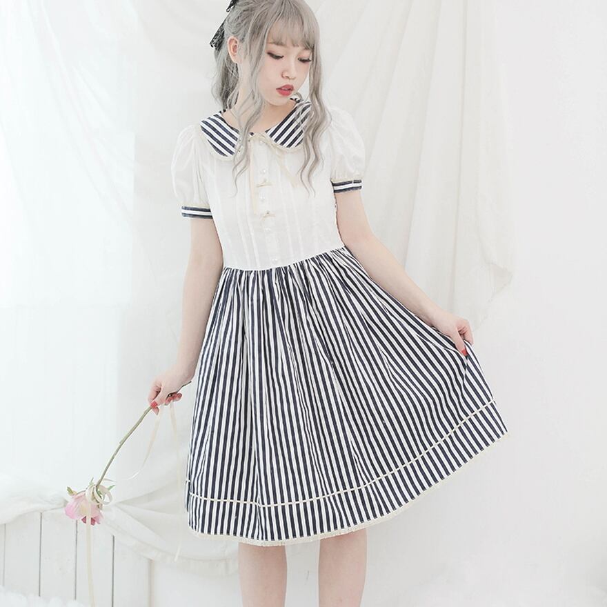 サブカル 服 地雷系 通販 ロリータ 半袖 ワンピース JKファッション ストライプ柄 レトロ ソフトロリータ 普段着使い